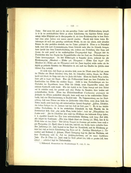 Natur. Und wenn sich auch in ihr eine gewaltige Natur- und Weltbetrachiung spiegelt, so ist sie im wirtschaftlichen Leben zu einem Katechismus des täglichen Lebens ausgemünzt, dessen Wahrheit um so überzeugender ist, als seine Erfahrungssätze in dem Kreislauf eines jeden Jahres von neuern erprobt wurden. Gewiß steht hinter diesen Erfahrungen oft noch eine gewaltige unbekannte Größe, die wir nur ahnen, nicht abmessen können, die aber zweifellos ebenfalls aus der Natur geschöpft ist. Wenn es in Biesenthal heißt, man solle nach Sonnenuntergang keinen Kehricht mehr über die Schwellt brmgen, dann spricht hier keine Naturbeobachtung mit, sondern eine Vorstellung über haus und Sonne, die weit zurück in der mythologischen Vergangenheit liegt. Dagegen sind die Vorschriften über den Beginn des Roggenschnittes oder der 5aat aus Beobachtungen der Natur hervorgegangen. Sie sind Wetterregeln in knappster Horm, während der alte Erfahrungssatz „Abendrot — Wetter got, Morgenrot — Wetter Tun begot" (Bei Abendrot ist's Wetter gut, bei Morgenrot wird der Zaun begossen) nichts weiter als die täglich zu prüfende Kenntnis der Atmosphäre ist, wie auch das Quaken der Hrösche einen schönen Tag verheißt.