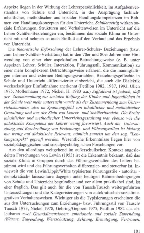 Aspekte liegen in der Wirkung der Lehrerpersönlichkeit, im Aufgabenverständnis von Schule und Unterricht, in der Ausprägung fachlichinhaltlicher, methodischer und sozialer Handlungskompetenzen im Rahmen von Handlungskonzepten für den Unterricht. Schülerseitig wirken soziale Erfahrungen, Strukturen und Verhaltenweisen im Unterricht auf die Lehrer-Schüler-Beziehungen ein, bestimmen das soziale Klima im Unterricht mit und nehmen so auch Einfluß auf den Verlauf und das Ergebnis von Unterricht.