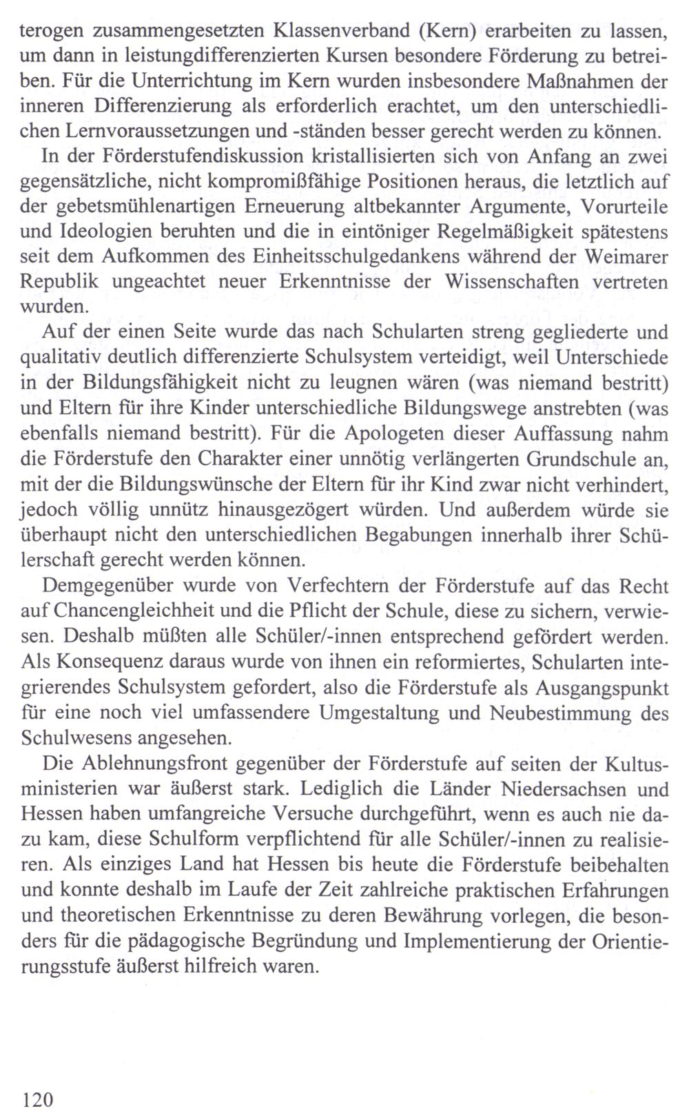 Die Ablehnungsfront gegenüber der Förderstufe auf seiten der Kultusministerien war äußerst stark. Lediglich die Länder Niedersachsen und Hessen haben umfangreiche Versuche durchgeführt, wenn es auch nie dazu kam, diese Schulform verpflichtend für alle Schüler/-innen zu realisieren. Als einziges Land hat Hessen bis heute die Förderstufe beibehalten und konnte deshalb im Laufe der Zeit zahlreiche praktischen Erfahrungen und theoretischen Erkenntnisse zu deren Bewährung vorlegen, die besonders für die pädagogische Begründung und Implementierung der Orientierungsstufe äußerst hilfreich waren.