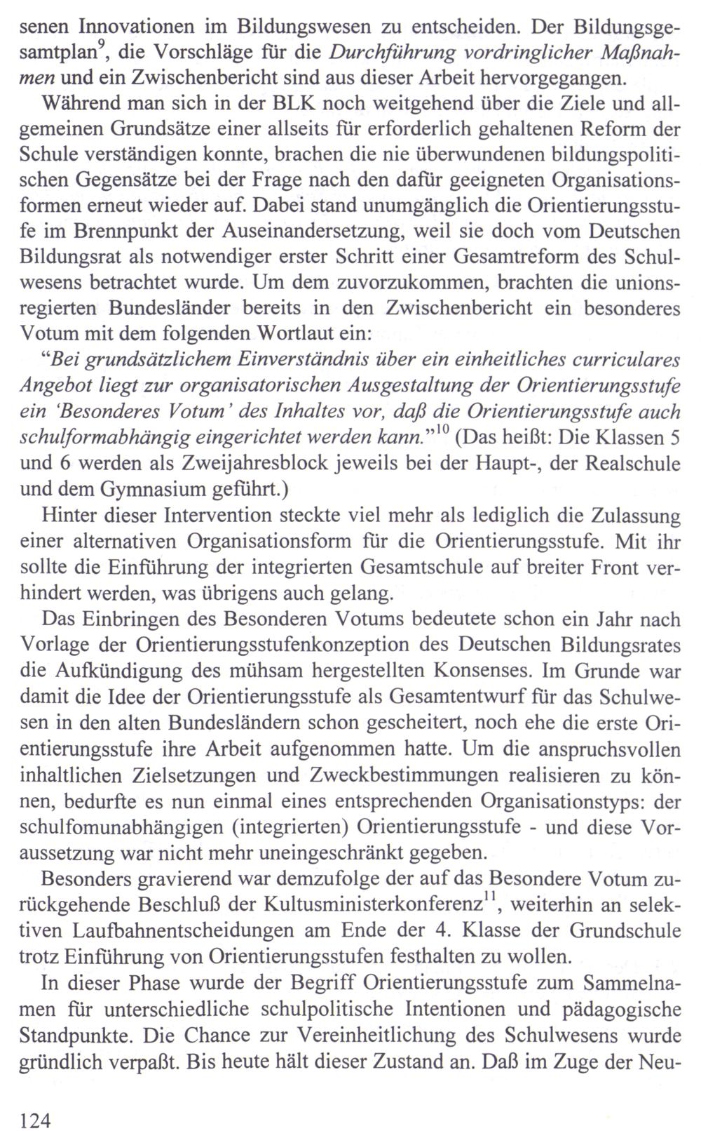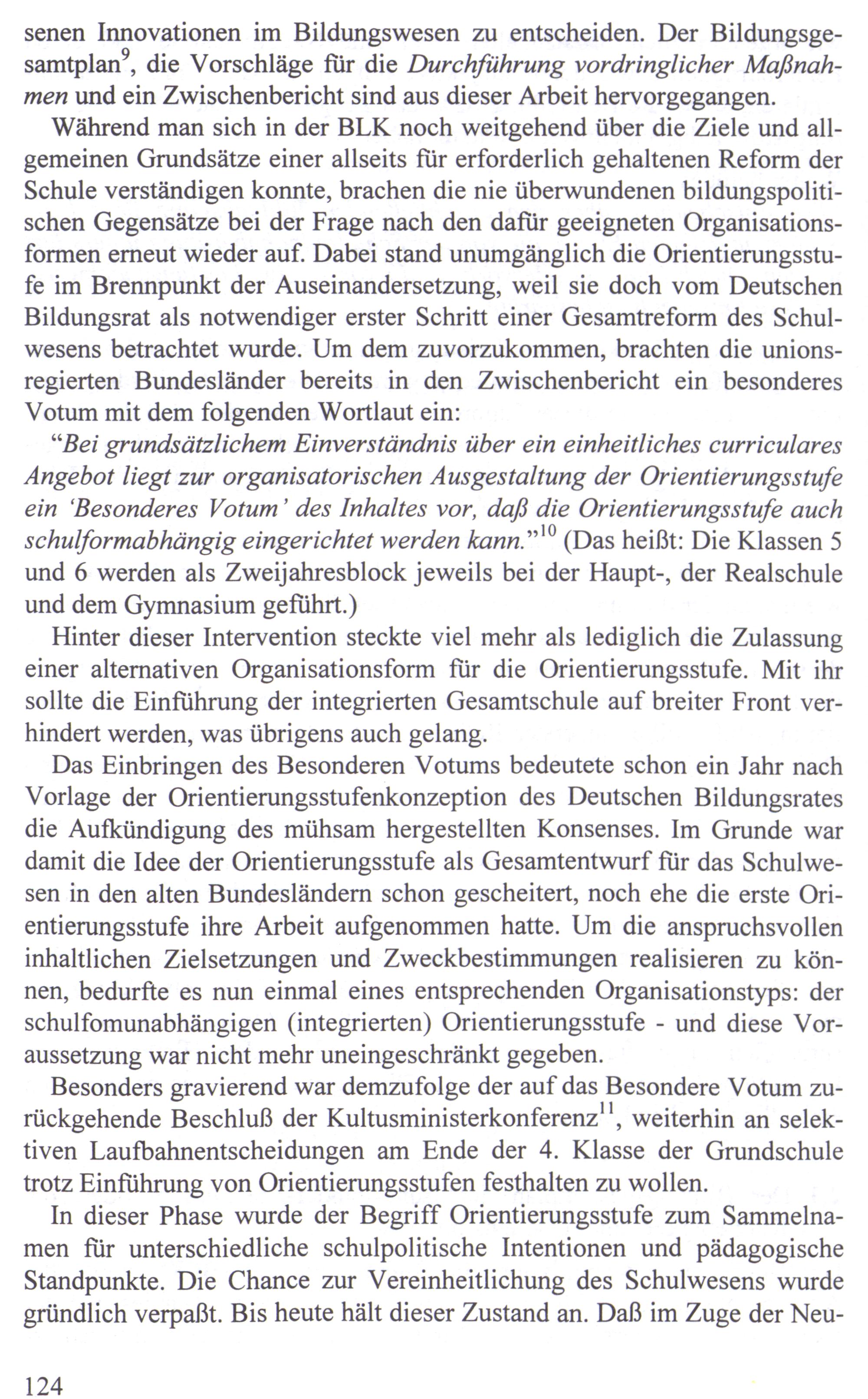 Während man sich in der BLK noch weitgehend über die Ziele und allgemeinen Grundsätze einer allseits für erforderlich gehaltenen Reform der Schule verständigen konnte, brachen die nie überwundenen bildungspolitischen Gegensätze bei der Frage nach den dafür geeigneten Organisationsformen erneut wieder auf. Dabei stand unumgänglich die Orientierungsstufe im Brennpunkt der Auseinandersetzung, weil sie doch vom Deutschen Bildungsrat als notwendiger erster Schritt einer Gesamtreform des Schulwesens betrachtet wurde. Um dem zuvorzukommen, brachten die unionsregierten Bundesländer bereits in den Zwischenbericht ein besonderes Votum mit dem folgenden Wortlaut ein: