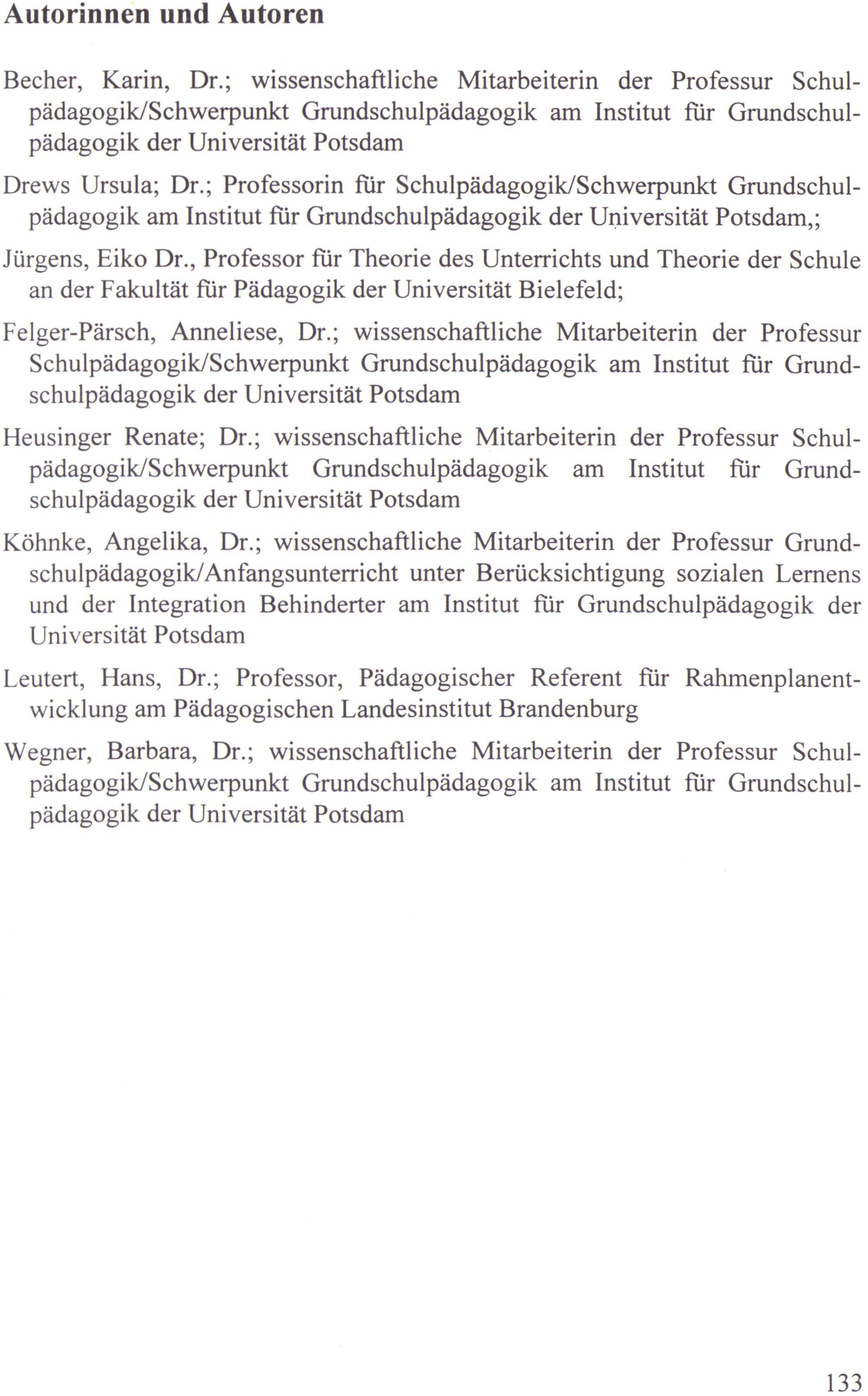 Felger-Pärsch, Anneliese, Dr.; wissenschaftliche Mitarbeiterin der Professur Schulpädagogik/Schwerpunkt Grundschulpädagogik am Institut für Grundschulpädagogik der Universität Potsdam