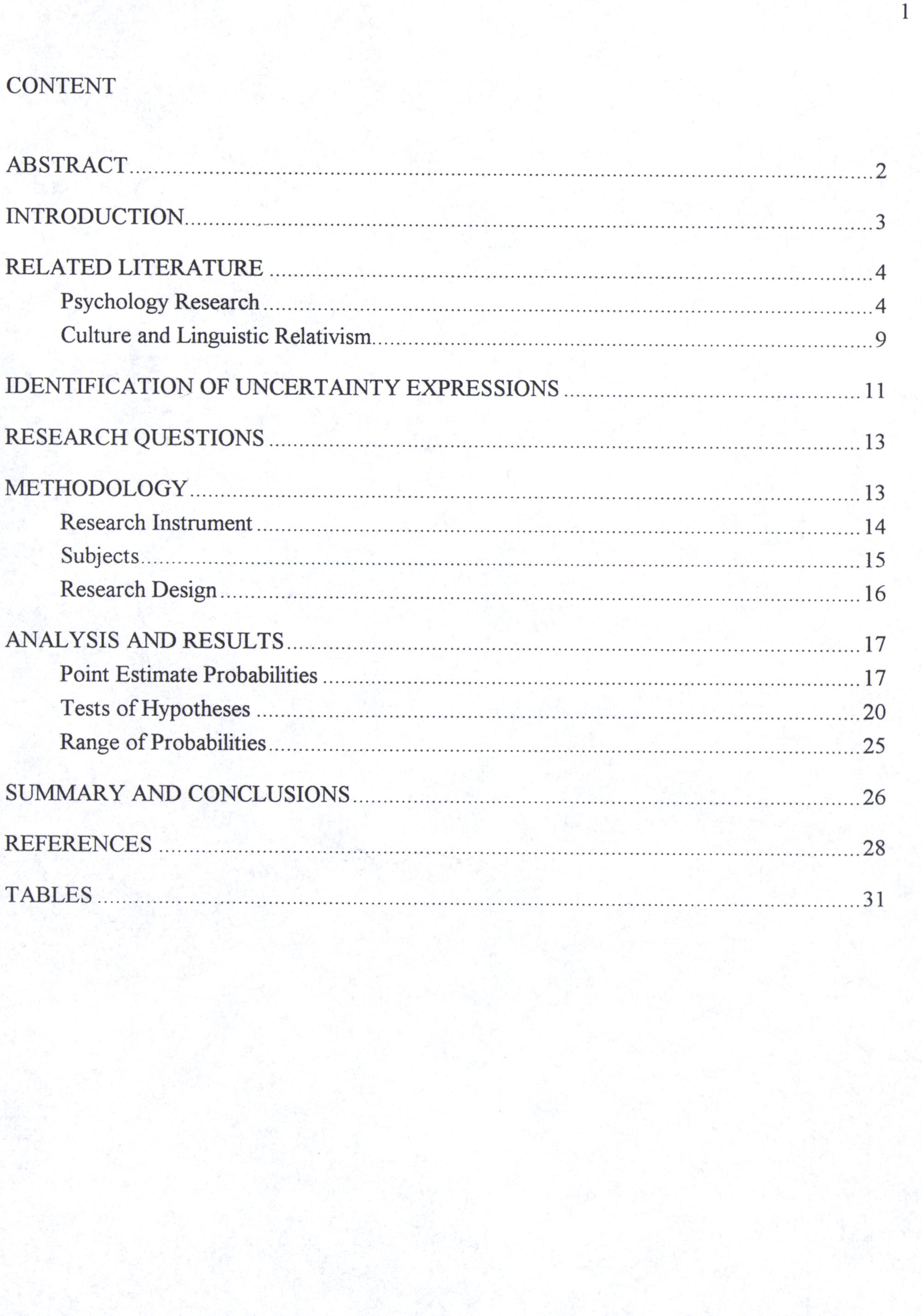 A A 2 INTRODUCTION ke rettete 3 RELATED LITERATUR are re tt 4 Psychology Research. er ee 4 Culture and Linguistic RelativisM....ee ee 9 IDENTIFICATION OF UNCERTAINTY EXPRESSION terre 11 RESEARCH QUESTIONS 13 METHOD O LOG Ya rei rt 13 Research Instrument ee 14 = N DC 15 Research Designer er He Er net ke N 16 ANALYSIS AND RESULTS rer enge a EN U 17 Point Estimate Probabilities.... rn rer 17 Tests Of HypoOteSCS ren ee 20 Range of Probabilities:: nei rt 25 SUMMARY AND CONCLUSIONS. En 26 REFERENCES EEE Er rer ea Ct ae 28