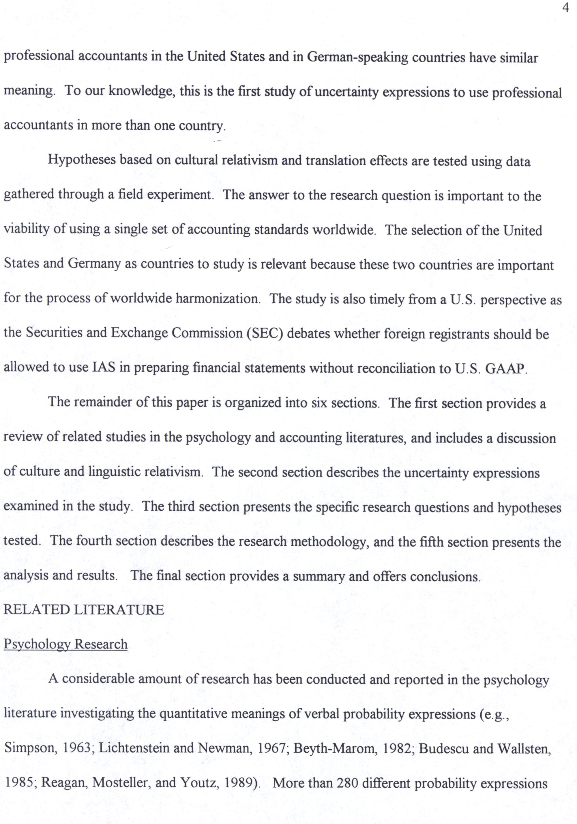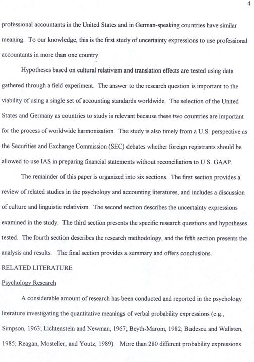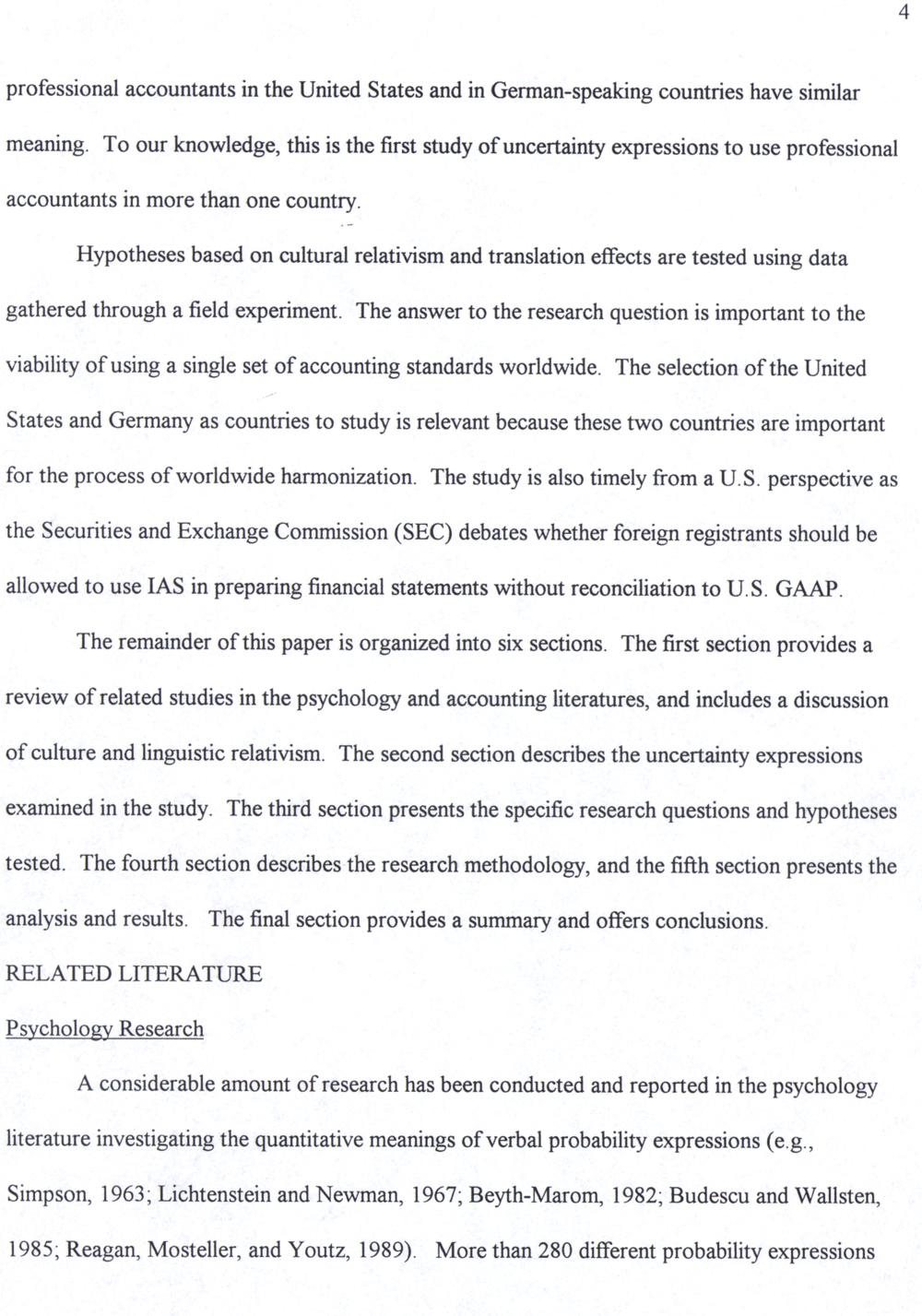 Hypotheses based on cultural relativism and translation effects are tested using data gathered through a field experiment. The answer to the research question is important to the viability of using a single set of accounting standards worldwide. The selection of the United States and Germany as Countries to study is relevant because these two countries are important for the process of worldwide harmonization. The study is also timely from a U.S. perspective as the Securities and Exchange Commission(SEC) debates whether foreign registrants should be allowed to use IAS in preparing financial statements without reconciliation to U.S. GAAP.