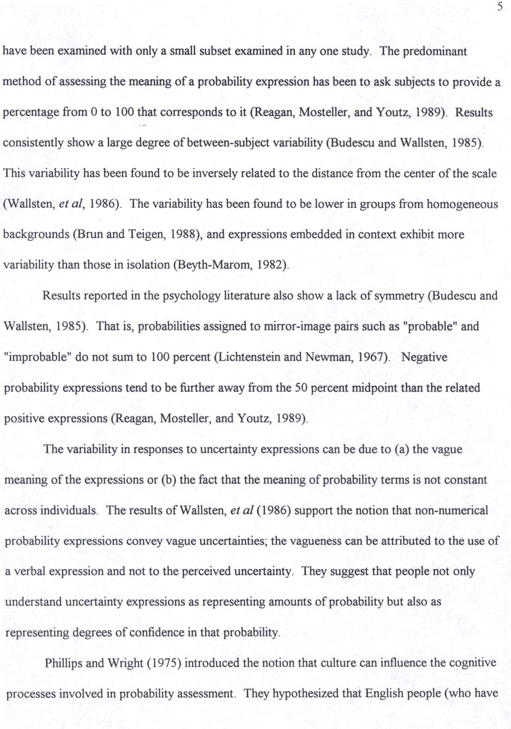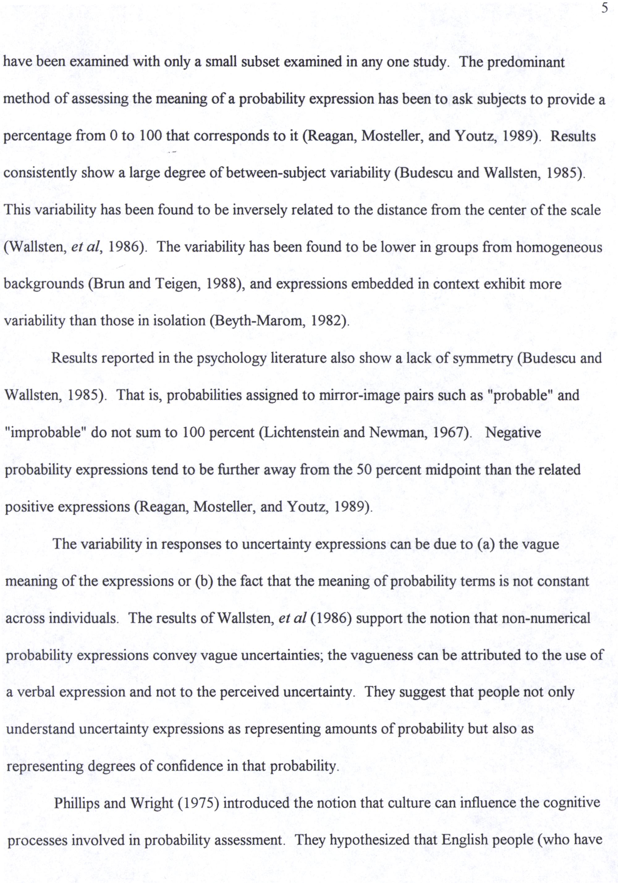 Results reported in the psychology literature also show a lack of symmetry(Budescu and Wallsten, 1985). That is, probabilities assıgned to mirror-ımage pairs such as"probable" and "improbable" do not sum to 100 percent(Lichtenstein and Newman, 1967). Negative probability expressions tend to be further away from the 50 percent midpoint than the related positive expressions(Reagan, Mosteller, and Youtz, 1989).