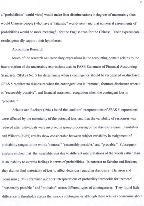 Much of the research on uncertainty expressions in the accounting domain relates to the interpretation of the uncertainty expressions used in FASB Statement of Financial Accounting Standards(SFAS) No. 5 for determining when a contingency should be recognized or disclosed. SFAS 5 requires no disclosure when the contingent loss is“remote”, footnote disclosure when it is“reasonably possible”, and financial statement recognition when the contingent loss ıs "probable."