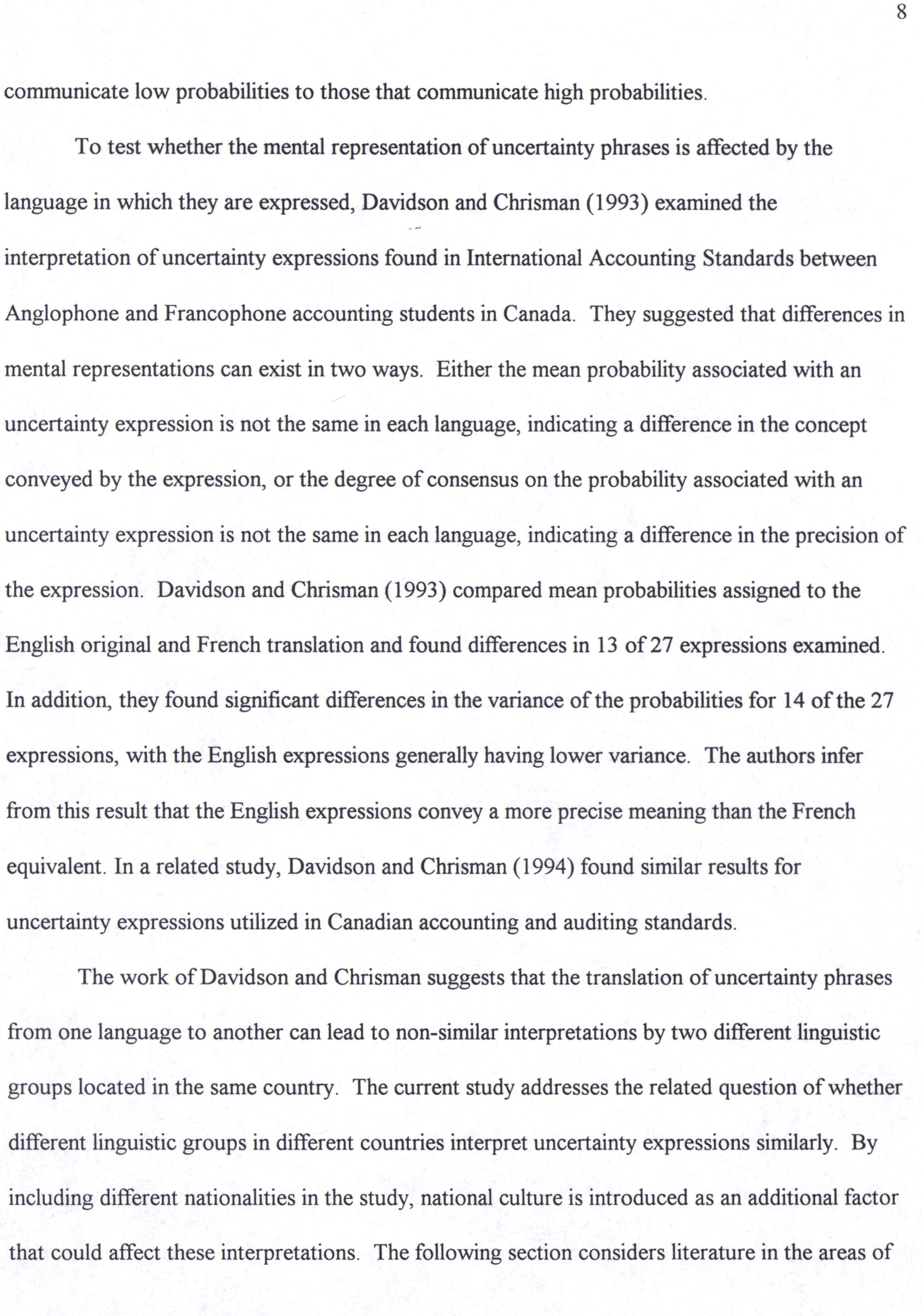 To test whether the mental representation of uncertainty phrases is affected by the language ın which they are expressed, Davidson and Chrisman(1993) examined the interpretation of uncertainty expressions found in International Accounting Standards between Anglophone and Francophone accounting students in Canada. They suggested that differences in mental representations can exist in two ways. Either the mean probability associated with an uncertainty expression Is not the same in each language, indicating a difference in the concept conveyed by the expression, or the degree of consensus on the probability associated with an uncertainty expression 1s not the same in each language, indicating a difference in the precision of the expression. Davıdson and Chrisman(1993) compared mean probabilities assigned to the Englısh original and French translation and found differences in 13 of 27 expressions examined. In addition, they found significant differences in the variance of the probabilities for 14 of the 27 expressions, with the English expressions generally having lower variance. The authors infer from this result that the English expressions convey a more precise meaning than the French equivalent. In a related study, Davidson and Chrisman(1994) found similar results for uncertainty expressions utilized in Canadian accounting and auditing standards.