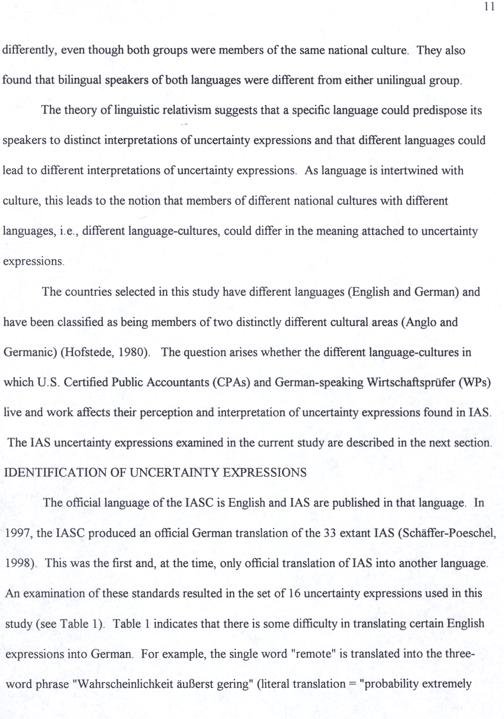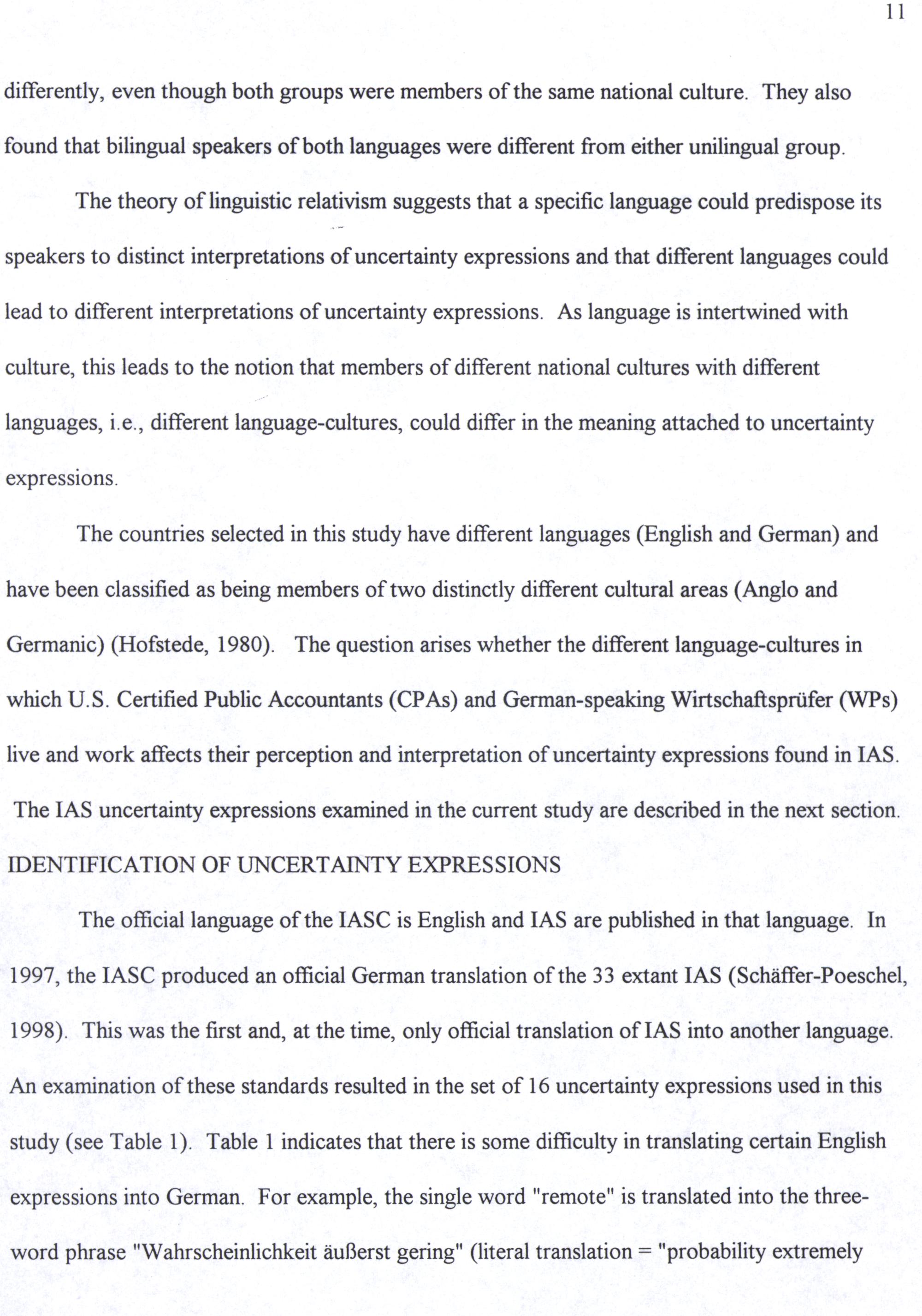 The countries selected in this study have different languages(English and German) and have been classified as being members of two distinctly different cultural areas(Anglo and Germanic)(Hofstede, 1980). The question arises whether the different language-cultures in which U.S. Certified Public Accountants(CPAs) and German-speaking Wirtschaftsprüfer(WPs) live and work affects their perception and interpretation of uncertainty expressions found in IAS.