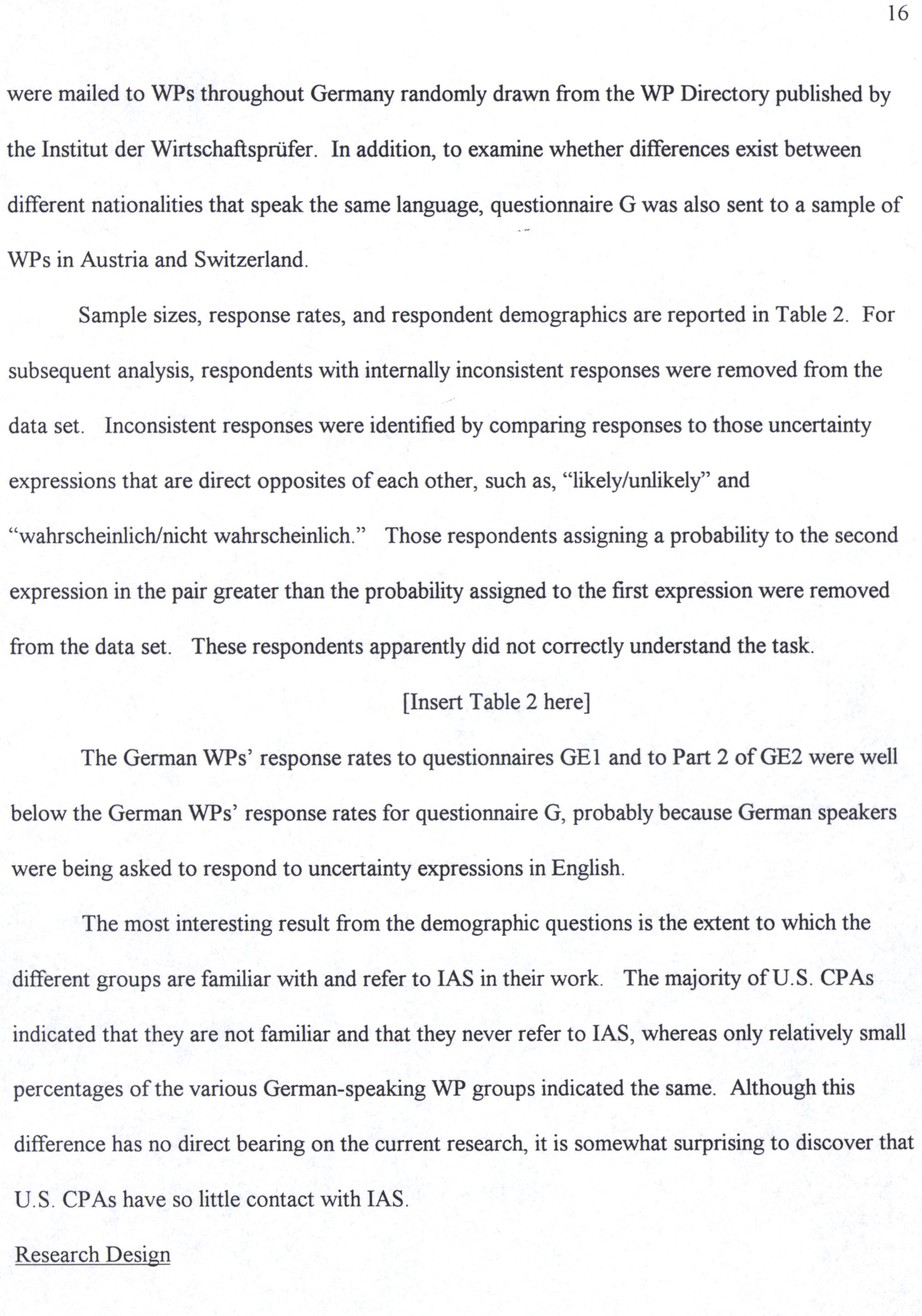 were mailed to WPs throughout Germany randomly drawn from the WP Directory published by the Institut der Wirtschaftsprüfer. In addition, to examine whether differences exist between different nationalities that speak the same language, questionnaire G was also sent to a sample of WPs in Austria and Switzerland.