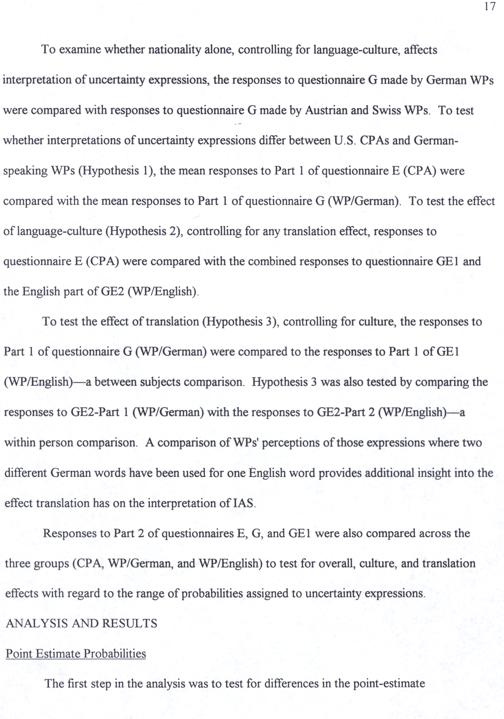 To examine whether nationality alone, controlling for language-culture, affects interpretation of uncertainty expressions, the responses to questionnaire G made by German WPs were compared with responses to questionnaire G made by Austrian and Swiss WPs. To test whether interpretations of uncertainty EPrENSIONS differ between U.S. CPAs and Germanspeakıng WPs(Hypothesis 1), the mean responses to Part 1 of questionnaire E(CPA) were compared with the mean responses to Part 1 of questionnaire G(WP/German). To test the effect of language-culture(Hypothesis 2), controlling for any translation effect, responses to questionnaire E(CPA) were compared with the combined responses to questionnaire GE1 and the English part of GE2(WP/English).