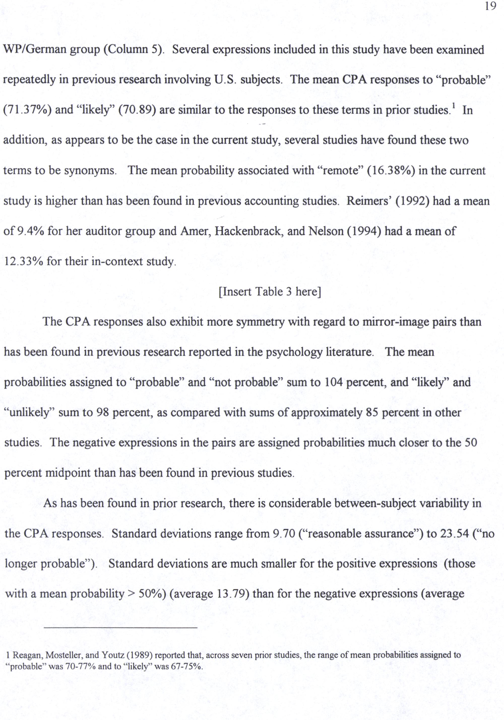 WP/German group(Column 5). Several expressions included in this study have been examined repeatedly ın previous research involving U.S. subjects. The mean CPA responses to“probable” (71.37%) and“likely”(70.89) are similar to the responses to these terms in prior studies.! In addition, as appears to be the case in the current sindyı several studies have found these two terms to be synonyms. The mean probability associated with“remote”(16.38%) in the current study ıs higher than has been found in previous accounting studies. Reimers’(1992) had a mean of 9.4% for her auditor group and Amer, Hackenbrack: and Nelson(1994) had a mean of 12.33% for their in-context study.