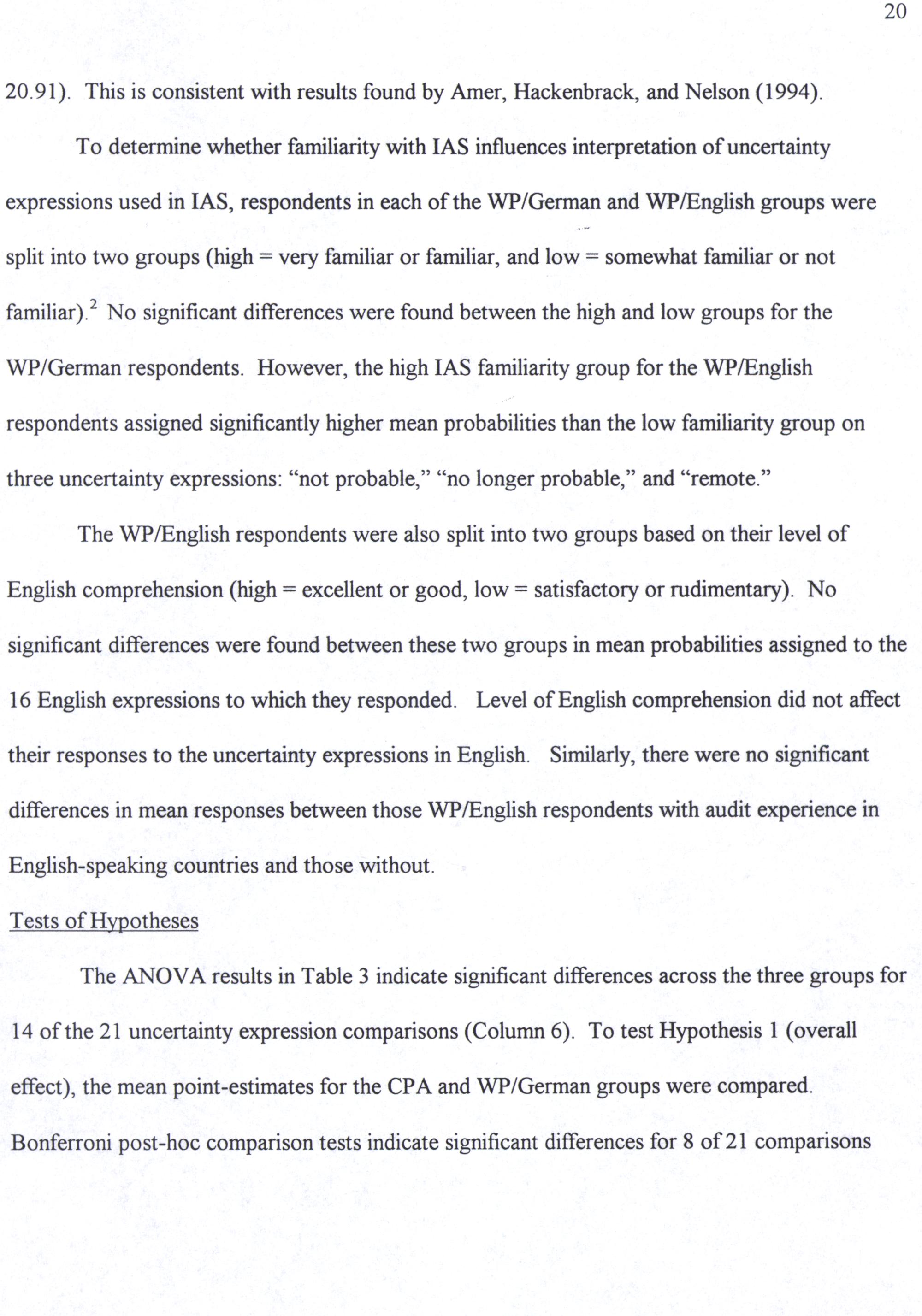 The WP/English respondents were also split into two groups based on their level of English comprehension(high= excellent or good, low= satisfactory or rudimentary). No significant differences were found between these two groups in mean probabilities assigned to the 16 English expressions to which they responded. Level of English comprehension did not affect their responses to the uncertainty expressions in English. Similarly, there were no significant differences in mean responses between those WP/English respondents with audit experience in English-speaking countries and those without.