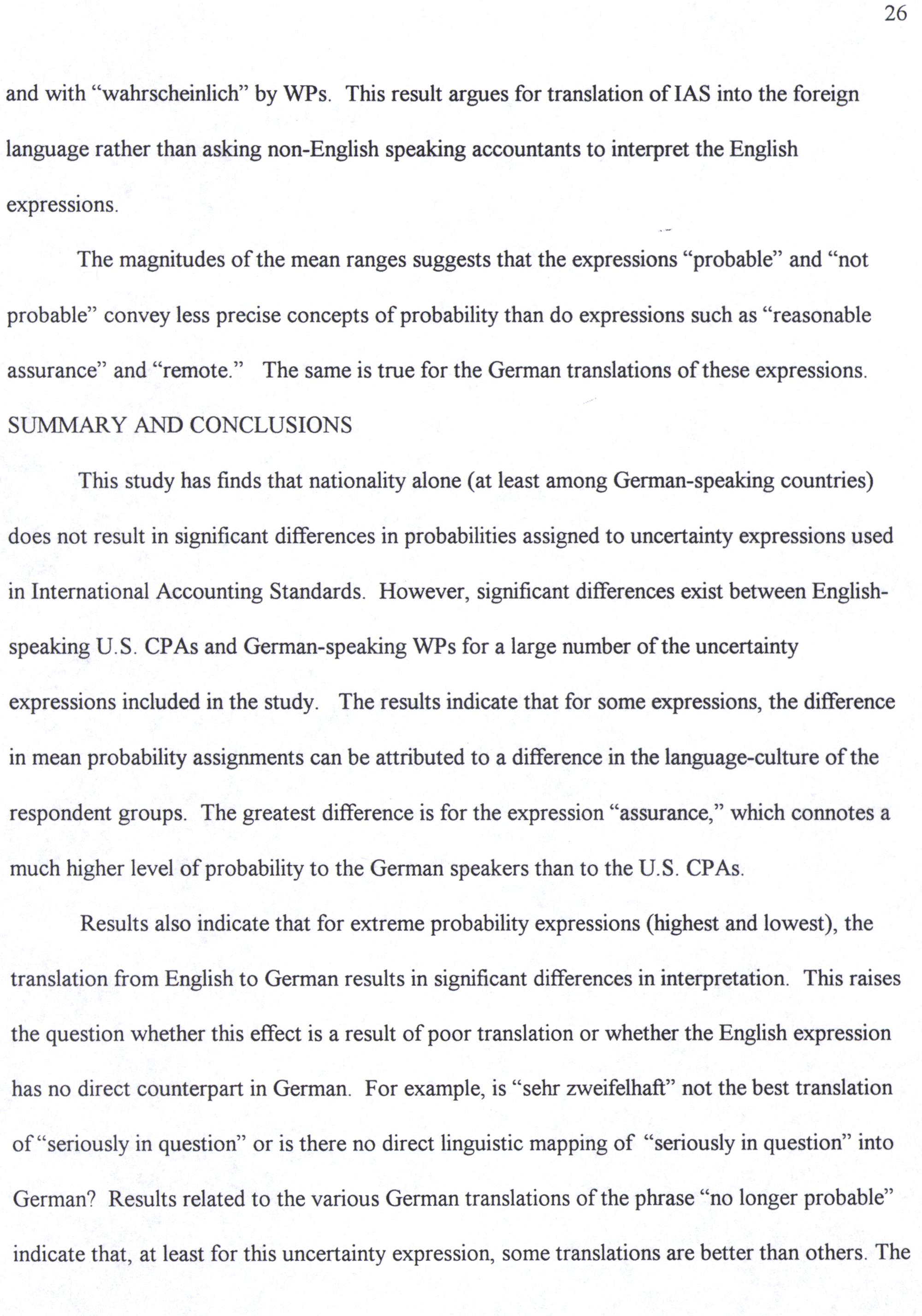 The magnitudes of the mean ranges suggests that the expressions“probable” and“not probable” convey less precise concepts of probability than do expressions such as“reasonable assurance” and“remote.” The same is true for the German translations of these expressions. SUMMARY AND CONCLUSIONS
