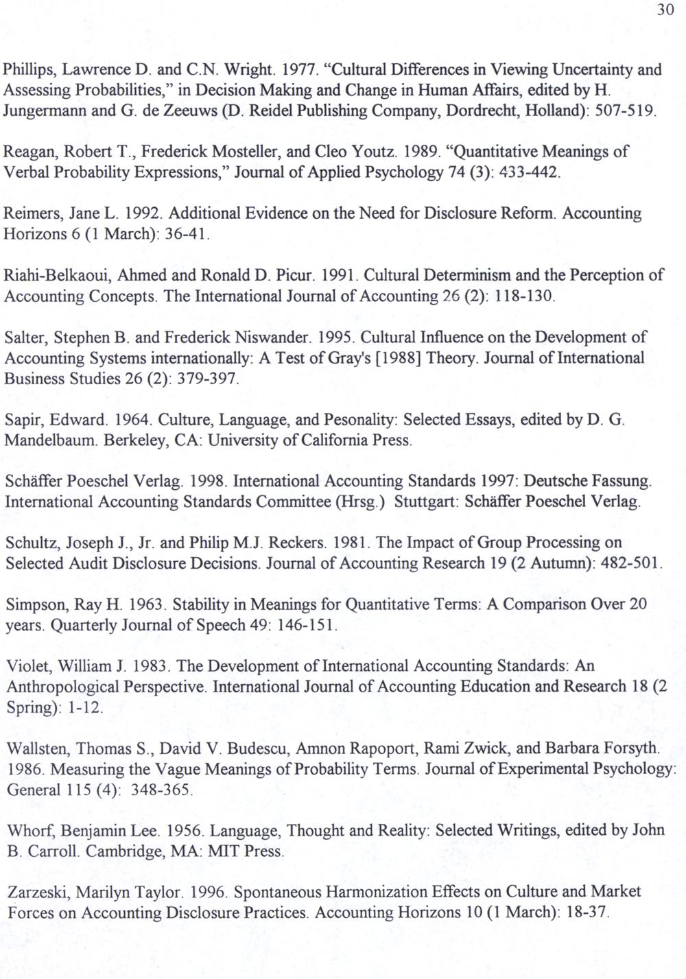 Riahi-Belkaoui, Ahmed and Ronald D. Picur. 1991. Cultural Determinism and the Perception of Accounting Concepts. The International Journal of Accounting 26(2): 118-130.