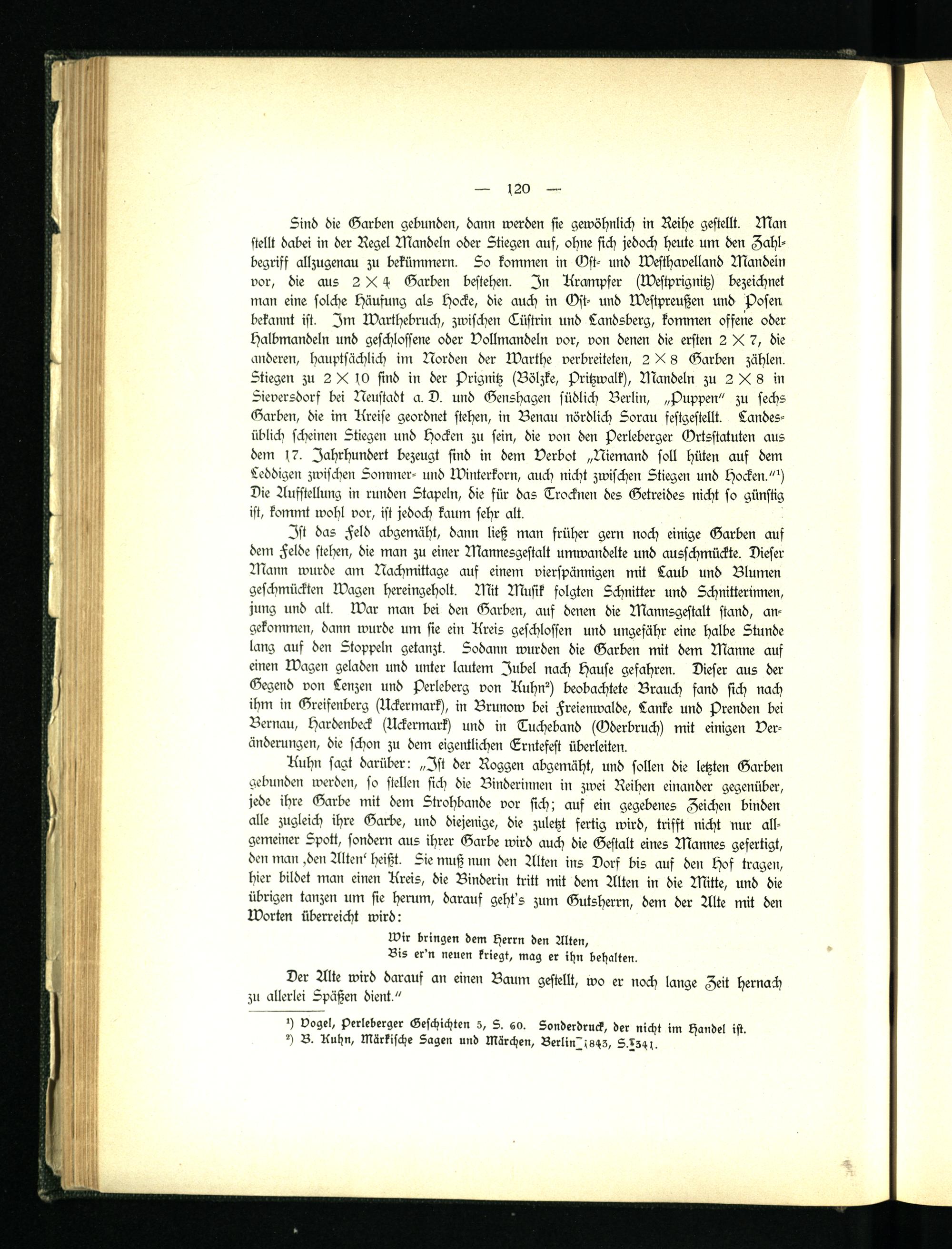 Kuhn sagt darüber: „Ist der Roggen abgemäht, und sollen die letzten Garben gebunden werden, so stellen sich die Binderinnen in zwei Reihen einander gegenüber, jede ihre Garbe mit dem Strohbande vor sich; auf ein gegebenes Zeichen binden alle zugleich ihre Garbe, und diejenige, die zuletzt fertig wird, trifft nicht nur allgemeiner Spott, sondern aus ihrer Garbe wird auch die Gestalt eines Mannes gefertigt, den man .den Alte»' heißt. Sie muß nun den Alten ins Dorf bis auf den Hof tragen, hier bildet man einen Kreis, die Binderin tritt mit dem Alten in die Mitte, und die übrigen tanzen um sie herum, darauf geht s zum Gutsherrn, dem der Alte mit den Worten überreicht wird: