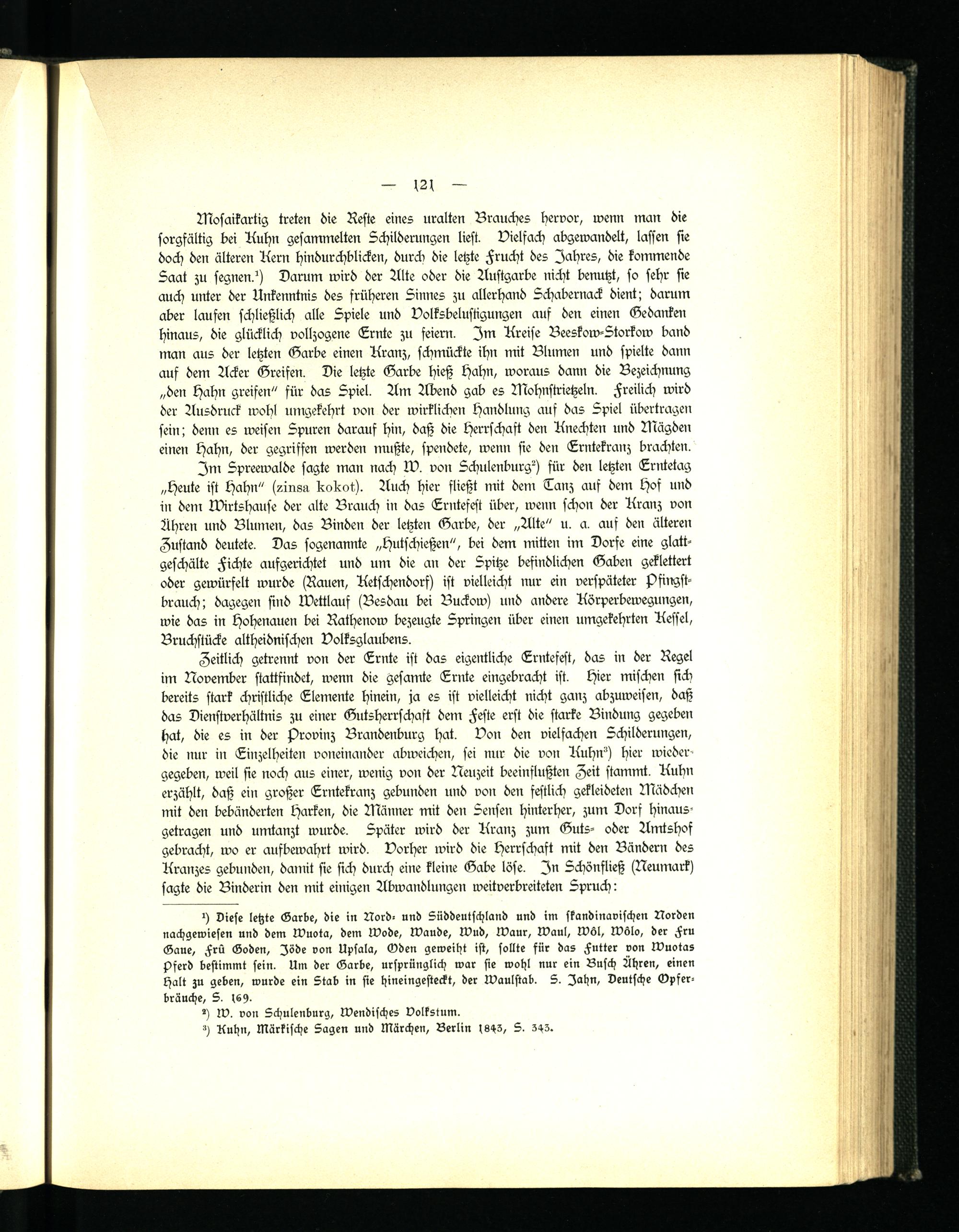 Im Spreewalde sagte man nach W. von Schulenburg') für den letzten Erntetag „Heute ist Hahn" (Knsn boirot). Auch hier fließt mit deni Tanz auf dem Hof und in dem Wirtshause der alte Brauch in das Erntefest über, wenn schon der Kranz von Ähren und Blumen, das Binden der letzten Garbe, der „Alte" u. a. auf den älteren Zustand deutete. Das sogenannte „Hutschießen", bei dem mitten im Dorfe eine glattgeschälte Fichte aufgerichtet und um die an der Spitze befindlichen Gaben geklettert oder gewürfelt wurde (Raum, Ketschendorf) ist vielleicht nur ein verspäteter Pfingst- brauch; dagegen sind Wettlauf (Besdau bei Buckow) und andere Körperbewegungen, wie das in Hohenauen bei Rathenow bezeugte Springen über einen umgekehrten Kessel, Bruchstücke altheidnischen Volksglaubens.