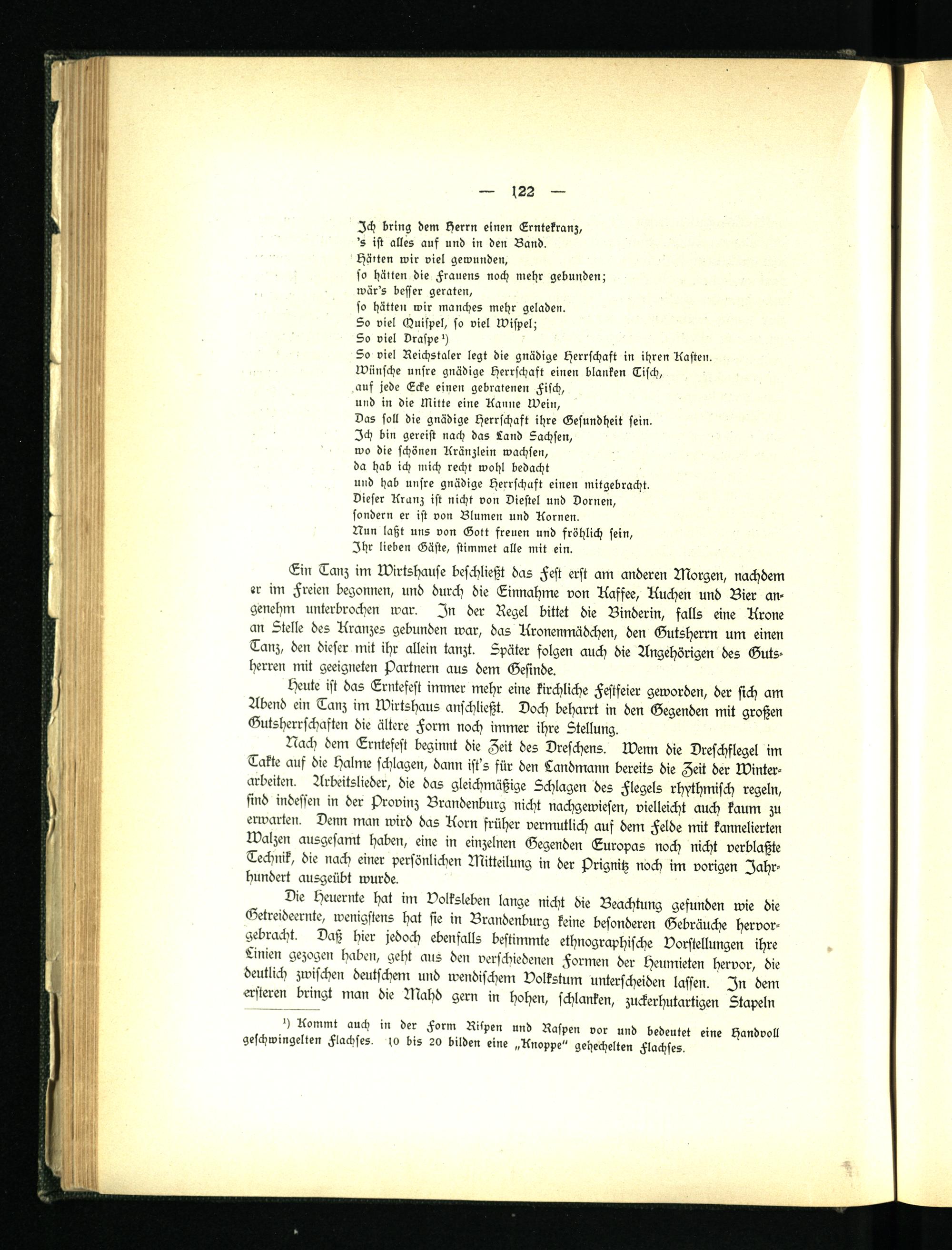 Nach dem Erntefest beginnt die Zeit des Dreschens. Wenn die Dreschflegel im Takte auf die Halme schlagen, dann ist's für den Landmann bereits die Zeit der Winterarbeiten. Arbeitslieder, die das gleichmäßige Schlagen des Flegels rhythmisch regeln, sind indessen in der Provinz Brandenburg nicht nachgewiesen, vielleicht auch kaum zu erwarten. Denn man wird das Korn früher vermutlich auf dem Felde mit kannelierten Walzen ausgesamt haben, eine in einzelnen Gegenden Europas noch nicht verblaßte Technik, die nach einer persönlichen Mitteilung in der prignitz noch im vorigen Iahr- bundert ausgeübt wurde.