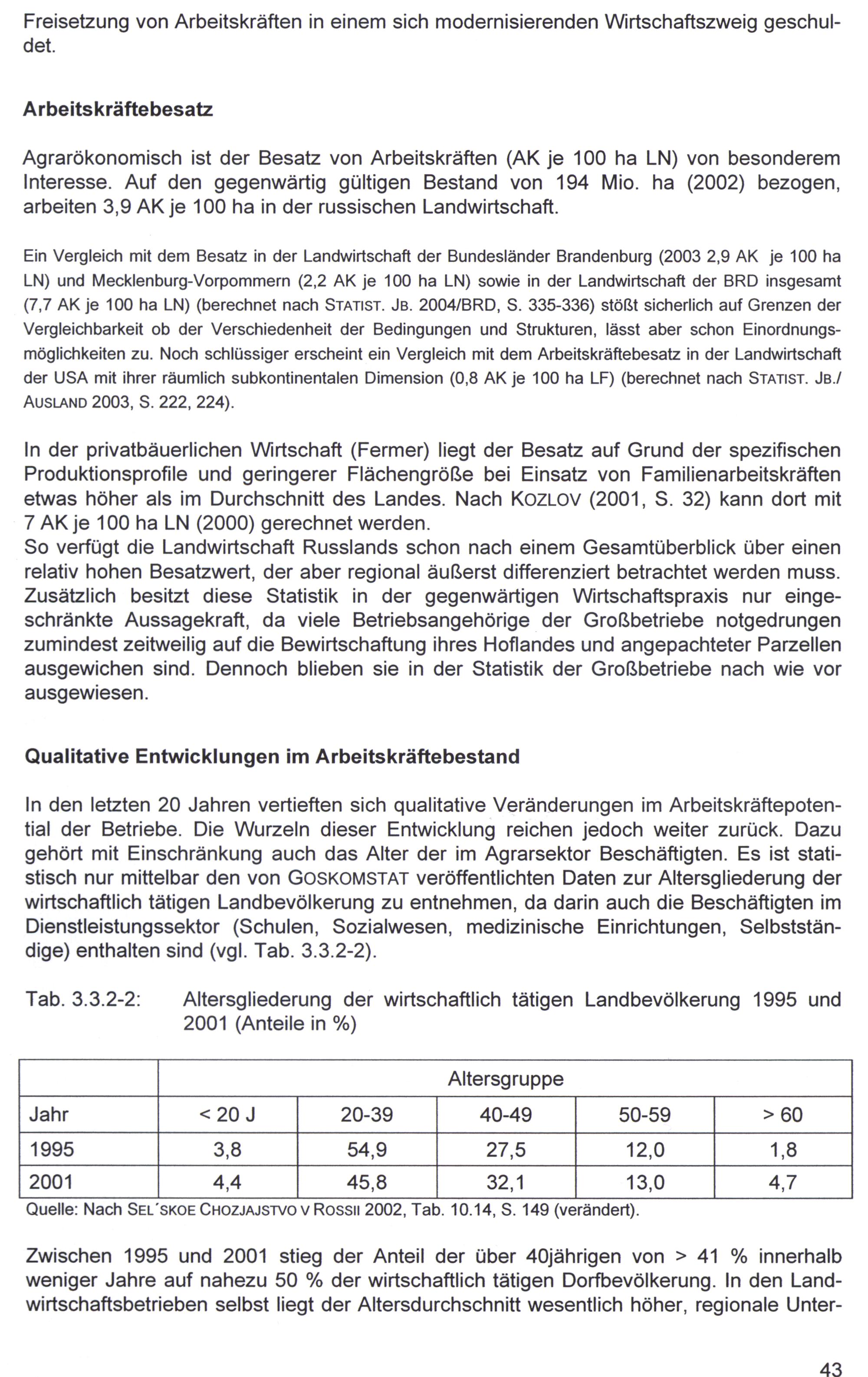 In den letzten 20 Jahren vertieften sich qualitative Veränderungen im Arbeitskräftepotential der Betriebe. Die Wurzeln dieser Entwicklung reichen jedoch weiter zurück. Dazu gehört mit Einschränkung auch das Alter der im Agrarsektor Beschäftigten. Es ist statistisch nur mittelbar den von GOSKOMSTAT veröffentlichten Daten zur Altersgliederung der wirtschaftlich tätigen Landbevölkerung zu entnehmen, da darin auch die Beschäftigten im Dienstleistungssektor(Schulen, Sozialwesen, medizinische Einrichtungen, Selbstständige) enthalten sind(vgl. Tab. 3.3.2-2).