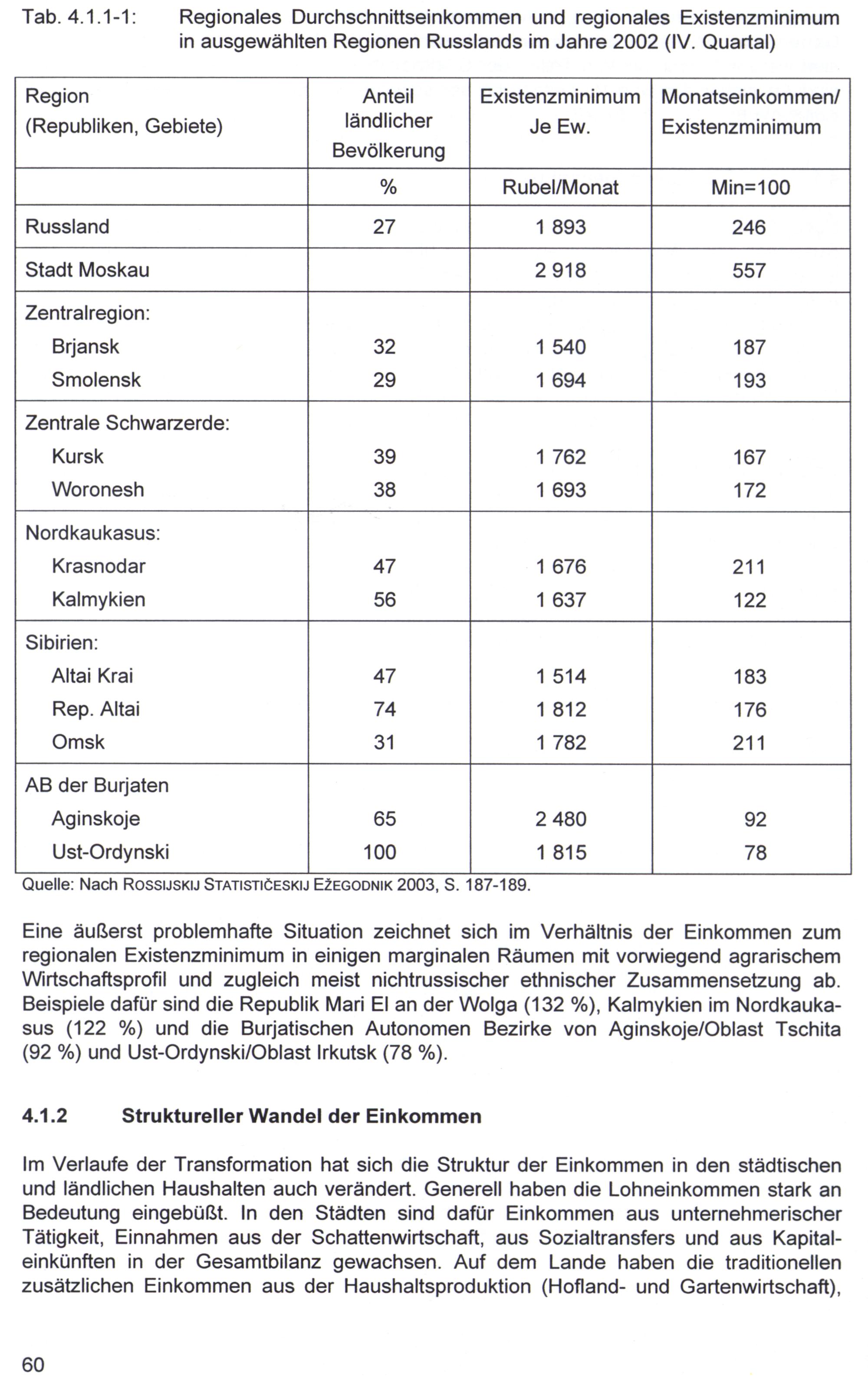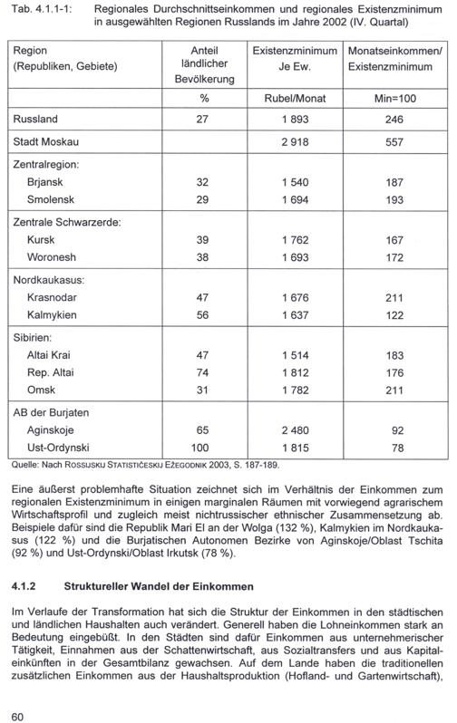 Eine äußerst problemhafte Situation zeichnet sich im Verhältnis der Einkommen zum regionalen Existenzminimum in einigen marginalen Räumen mit vorwiegend agrarischem Wirtschaftsprofil und zugleich meist nichtrussischer ethnischer Zusammensetzung ab. Beispiele dafür sind die Republik Mari El an der Wolga(132%), Kalmykien im Nordkaukasus(122%) und die Burjatischen Autonomen Bezirke von Aginskoje/Oblast Tschita (92%) und Ust-Ordynski/Oblast Irkutsk(78%).