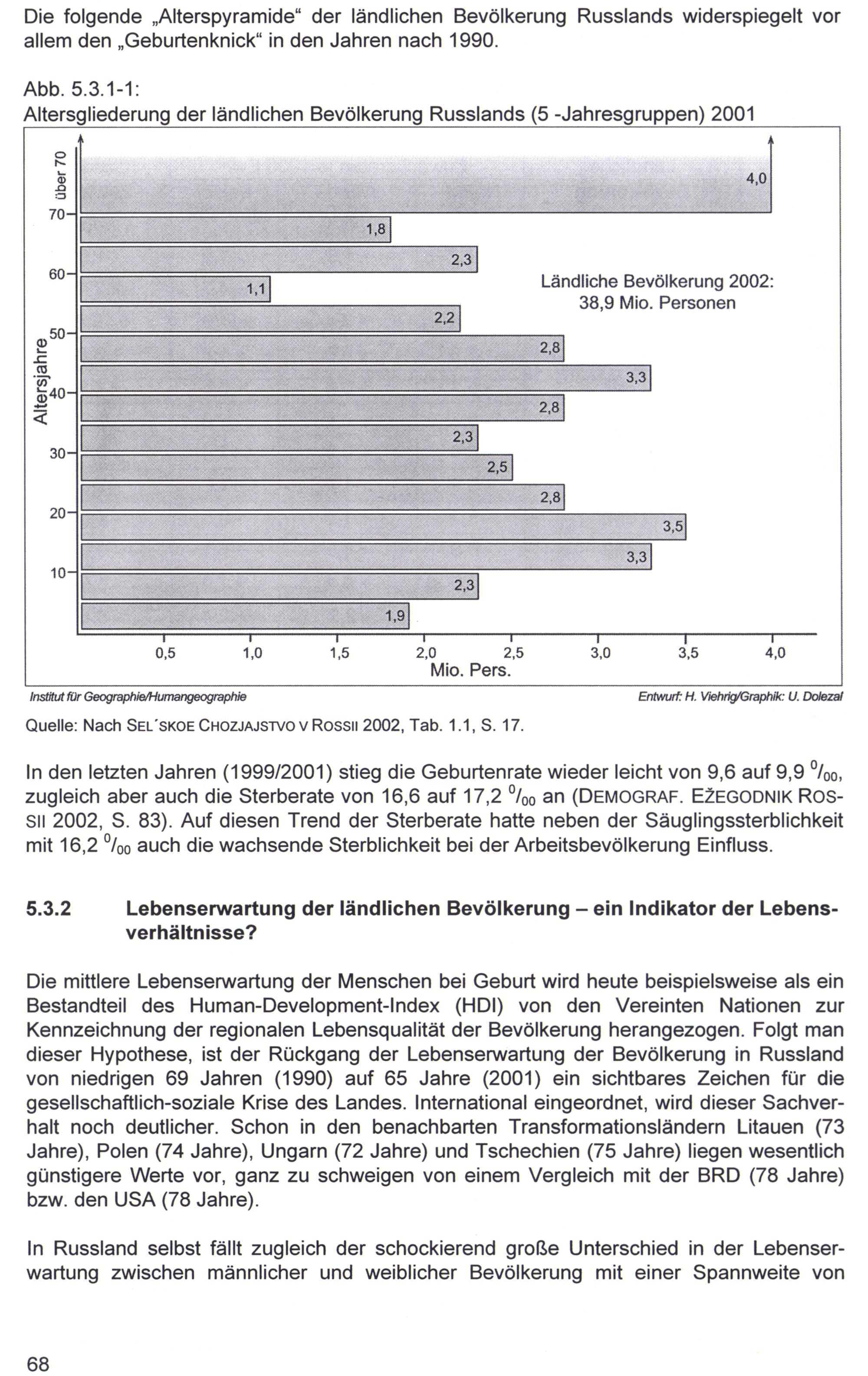 Die mittlere Lebenserwartung der Menschen bei Geburt wird heute beispielsweise als ein Bestandteil des Human-Development-Index(HDI) von den Vereinten Nationen zur Kennzeichnung der regionalen Lebensqualität der Bevölkerung herangezogen. Folgt man dieser Hypothese, ist der Rückgang der Lebenserwartung der Bevölkerung in Russland von niedrigen 69 Jahren(1990) auf 65 Jahre(2001) ein sichtbares Zeichen für die gesellschaftlich-soziale Krise des Landes. International eingeordnet, wird dieser Sachverhalt noch deutlicher. Schon in den benachbarten Transformationsländern Litauen(73 Jahre), Polen(74 Jahre), Ungarn(72 Jahre) und Tschechien(75 Jahre) liegen wesentlich günstigere Werte vor, ganz zu schweigen von einem Vergleich mit der BRD(78 Jahre) bzw. den USA(78 Jahre).