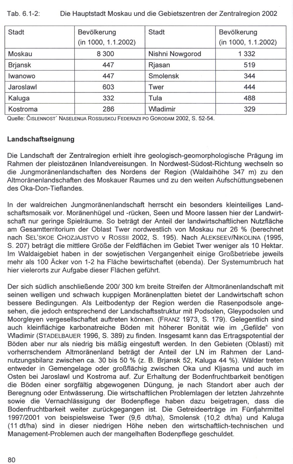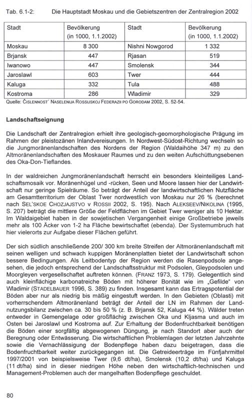 Tab. 6.1-2: Die Hauptstadt Moskau und die Gebietszentren der Zentralregion 2002