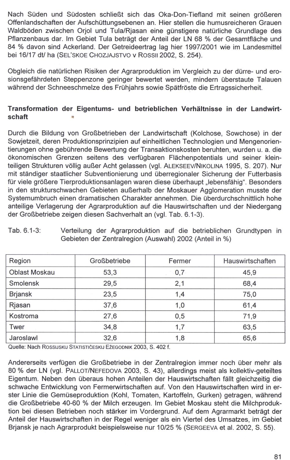 Durch die Bildung von Großbetrieben der Landwirtschaft(Kolchose, Sowchose) in der Sowjetzeit, deren Produktionsprinzipien auf einheitlichen Technologien und Mengenorientierungen ohne gebührende Bewertung der Transaktionskosten beruhten, wurden u. a. die ökonomischen Grenzen seitens des verfügbaren Flächenpotentials und seiner kleinteiligen Strukturen völlig außer Acht gelassen(vgl. ALEKSEEV/NIKOLINA 1995, S. 207). Nur mit ständiger staatlicher Subventionierung und überregionaler Sicherung der Futterbasis für viele größere Tierproduktionsanlagen waren diese überhaupt„lebensfähig“. Besonders in den strukturschwachen Gebieten außerhalb der Moskauer Agglomeration musste der Systemumbruch einen dramatischen Charakter annehmen. Die überdurchschnittlich hohe anteilige Verlagerung der Agrarproduktion auf die Hauswirtschaften und der Niedergang der Großbetriebe zeigen diesen Sachverhalt an(vgl. Tab. 6.1-3).