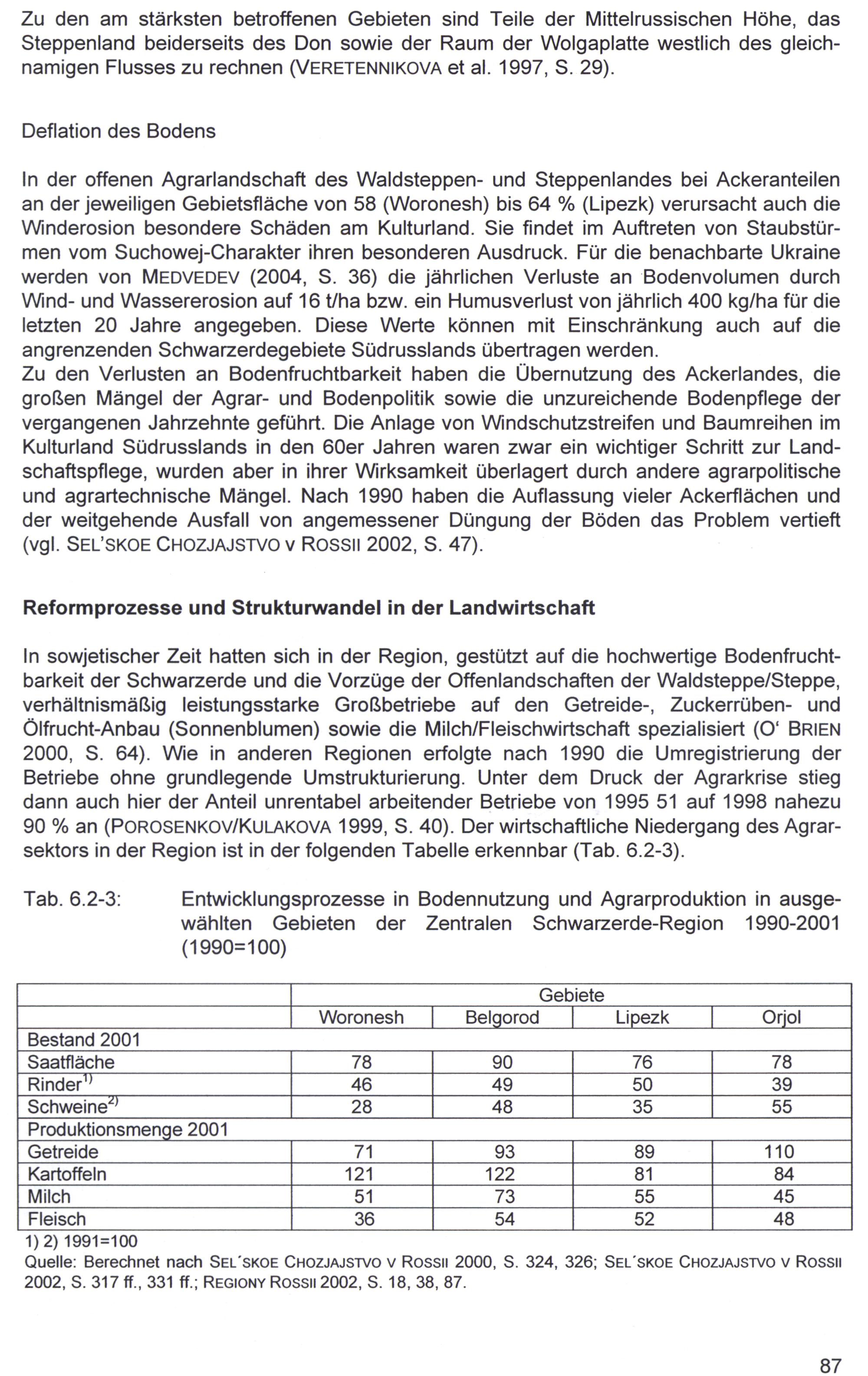 In sowjetischer Zeit hatten sich in der Region, gestützt auf die hochwertige Bodenfruchtbarkeit der Schwarzerde und die Vorzüge der Offenlandschaften der Waldsteppe/Steppe, verhältnismäßig leistungsstarke Großbetriebe auf den Getreide-, Zuckerrüben- und Ölfrucht-Anbau(Sonnenblumen) sowie die Milch/Fleischwirtschaft spezialisiert(O‘ BRIEN 2000, S. 64). Wie in anderen Regionen erfolgte nach 1990 die Umregistrierung der Betriebe ohne grundlegende Umstrukturierung. Unter dem Druck der Agrarkrise stieg dann auch hier der Anteil unrentabel arbeitender Betriebe von 1995 51 auf 1998 nahezu 90% an(POROSENKOV/KULAKOVA 1999, S. 40). Der wirtschaftliche Niedergang des Agrarsektors in der Region ist in der folgenden Tabelle erkennbar(Tab. 6.2-3).