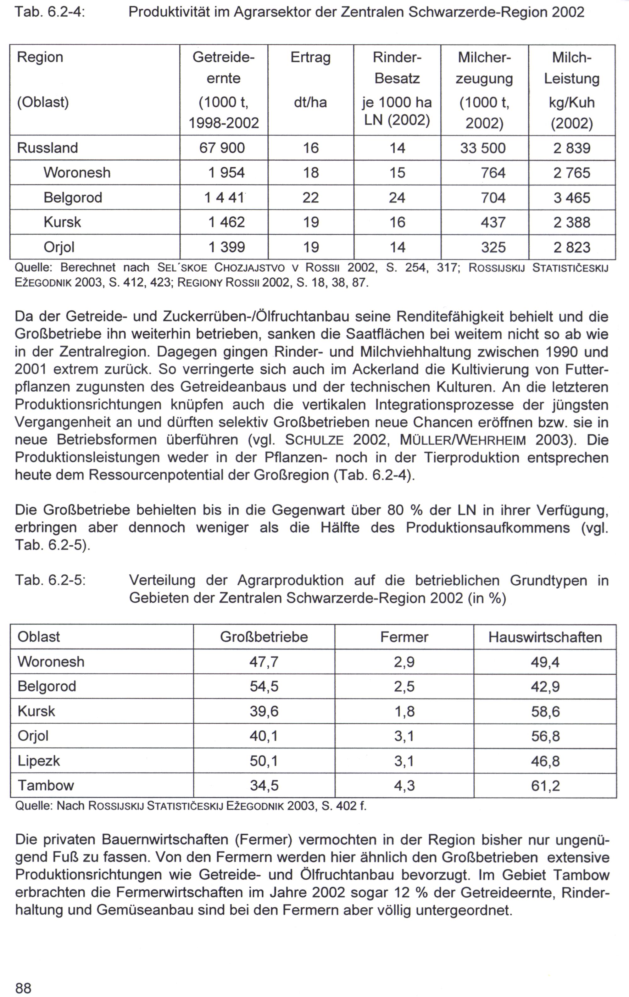 Quelle: Berechnet nach SEL’SKOE CHOZJAJSTVO V Rossıu 2002, S. 254, 317; ROSSIJSKIJ STATISTIGESKIJ EZEGODNIK 2003, S. 412, 423; REGIoNnY Rossır 2002, S. 18, 38, 87.