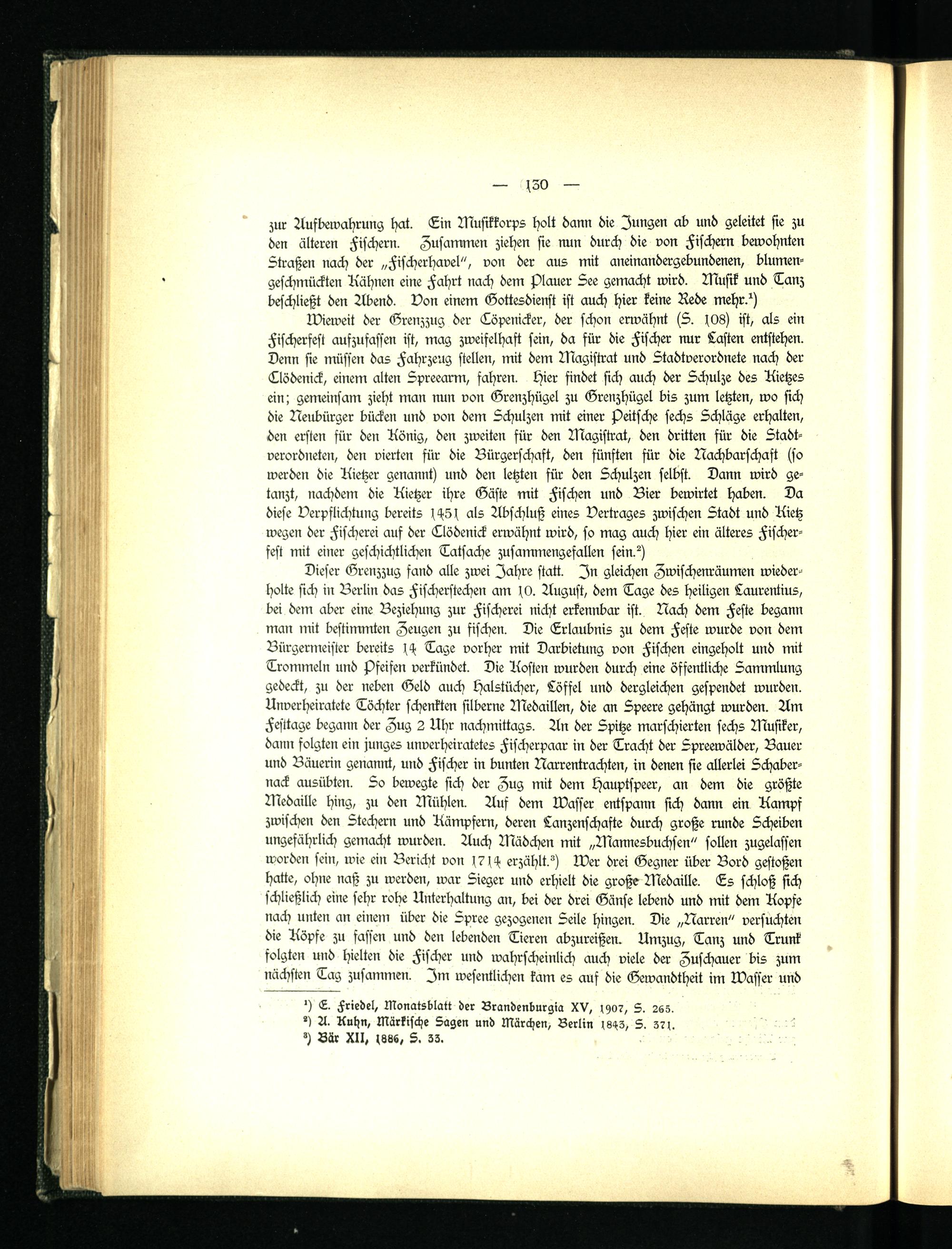 Wieweit der Grenzzug der Löpenicker, der schon erwähnt (S. s08) ist, als ein Fischerfest aufzufassen ist, mag zweifelhaft sein, da für die Fischer nur Lasten entstehen. Denn sie müssen das Fahrzeug stellen, mit dem Magistrat und Stadtverordnete nach der Llödenick, einem alten Spreearm, fahren, hier findet sich auch der Schulze des Rietzes ein; gemeinsam zieht man nun von Grenzhügel zu Grenzhügel bis zum letzten, wo sich die Neilbürger bücken und von dem Schulzen mit einer peitsche sechs Schläge erhalten, den ersten für den König, den zweiten für den Magistrat, den dritten für die Stadtverordneten, den vierten für die Bürgerschaft, den fünften für die Nachbarschaft (so werden die Kietzer genannt) und den letzten für den Schulzen selbst. Dann wird getanzt, nachdem die Kietzer ihre Gäste mit Fischen und Bier bewirtet haben. Da diese Verpflichtung bereits sHSs als Abschluß eines Vertrages zwischen Stadt und Rietz wegen der Fischerei auf der Llödenick erwähnt wird, so mag auch hier ein älteres Fischerfest mit einer geschichtlichen Tatsache zusammengefallen sein?)