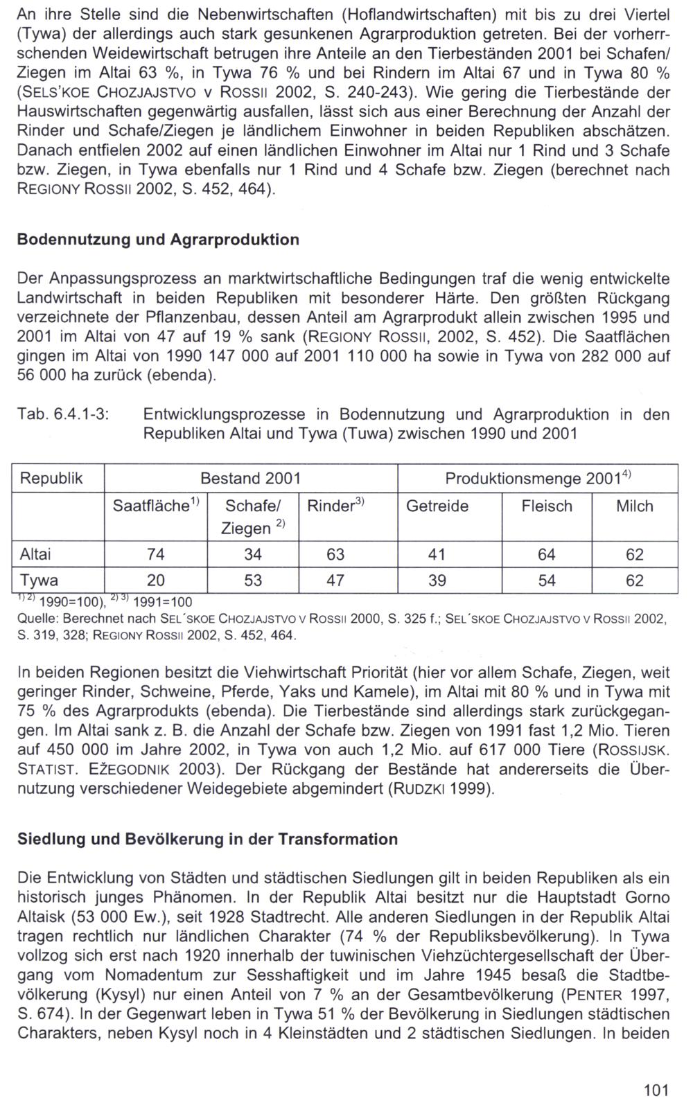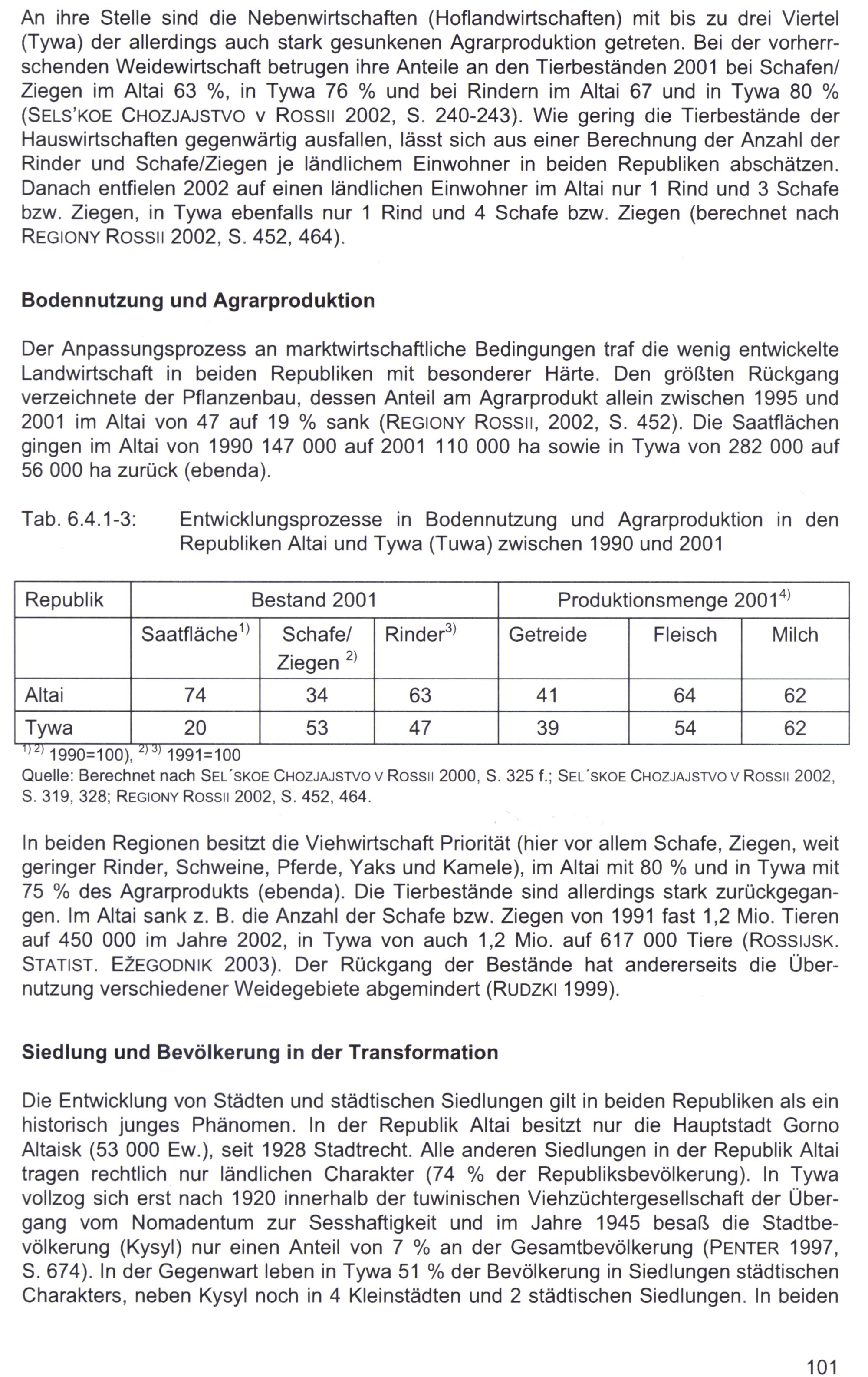 An ihre Stelle sind die Nebenwirtschaften(Hoflandwirtschaften) mit bis zu drei Viertel (Tywa) der allerdings auch stark gesunkenen Agrarproduktion getreten. Bei der vorherrschenden Weidewirtschaft betrugen ihre Anteile an den Tierbeständen 2001 bei Schafen/ Ziegen im Altai 63%, in Tywa 76% und bei Rindern im Altai 67 und in Tywa 80% (SELS’KOE CHOZJAJSTVO v Rossıl 2002, S. 240-243). Wie gering die Tierbestände der Hauswirtschaften gegenwärtig ausfallen, lässt sich aus einer Berechnung der Anzahl der Rinder und Schafe/Ziegen je ländlichem Einwohner in beiden Republiken abschätzen. Danach entfielen 2002 auf einen ländlichen Einwohner im Altai nur 1 Rind und 3 Schafe bzw. Ziegen, in Tywa ebenfalls nur 1 Rind und 4 Schafe bzw. Ziegen(berechnet nach REGIONY Rossı| 2002, S. 452, 464).