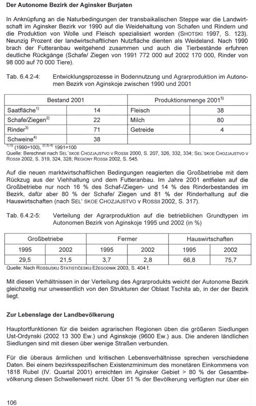 In Anknüpfung an die Naturbedingungen der transbaikalischen Steppe war die Landwirtschaft im Aginsker Bezirk vor 1990 auf die Weidehaltung von Schafen und Rindern und die Produktion von Wolle und Fleisch spezialisiert worden(SHOTSKI 1997, S. 123). Neunzig Prozent der landwirtschaftlichen Nutzfläche dienten als Weideland. Nach 1990 brach der Futteranbau weitgehend zusammen und auch die Tierbestände erfuhren deutliche Rückgänge(Schafe/ Ziegen von 1991 772 000 auf 2002 170 000, Rinder von 98 000 auf 70 000 Tiere).