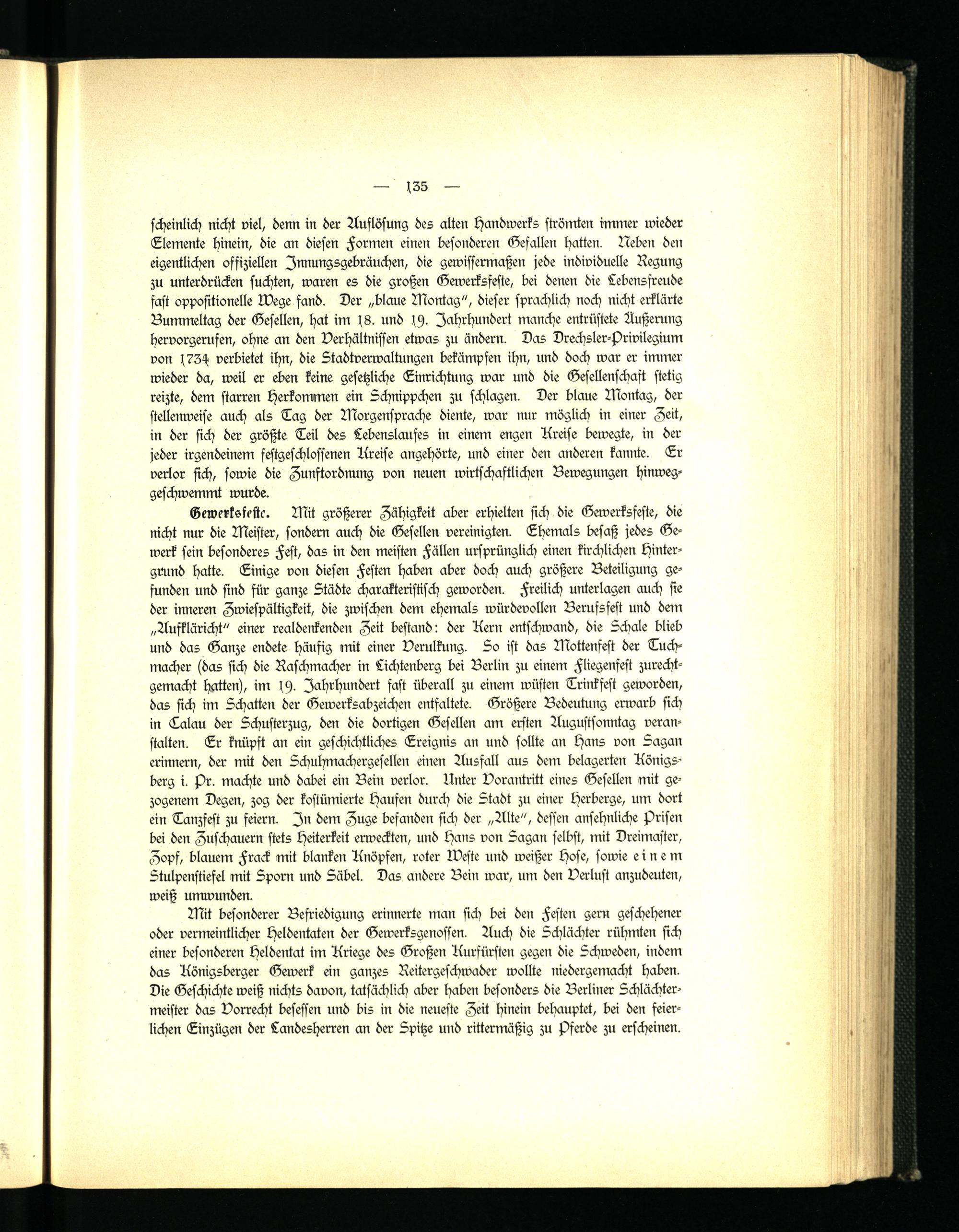 Gewerksfeste. Mit größerer Zähigkeit aber erhielten sich die Gewerksfeste, die nicht nur die Meister, sondern auch die Gesellen vereinigten. Ehemals besaß jedes Gewerk sein besonderes Fest, das in den meisten Fällen ursprünglich einen kirchlichen Hintergrund hatte. Einige von diesen Festen haben aber doch auch größere Beteiligung gefunden und sind für ganze Städte charakteristisch geworden. Freilich unterlagen auch sie der inneren Zwiespältigkeit, die zwischen dem ehemals würdevollen Berufsfest und dem „Aufkläricht" einer realdenkenden Zeit bestand: der Kern entschwand, die Schale blieb und das Ganze endete häufig mit einer Verulkung. So ist das Mottenfest der Tuchmacher (das sich die Raschmacher in Lichtenberg bei Berlin zu einem Fliegenfest zurechtgemacht hatten), im Iß. Jahrhundert fast überall zu einem wüsten Trinkfest geworden, das sich im Schatten der Gewerksabzeichen entfaltete. Größere Bedeutung erwarb sich in Talau der Schusterzug, den die dortigen Gesellen am ersten Augustsonntag veranstalten. Er knüpft an ein geschichtliches Ereignis an und sollte an Hans von Sagan erinnern, der mit den Schuhmachergesellen einen Ausfall aus dem belagerten Königsberg i. Pr. machte und dabei ein Bein verlor. Unter Vorantritt eines Gesellen mit gezogenem Degen, zog der kostümierte Haufen durch die Stadt zu einer Herberge, um dort ein Tanzfest zu feiern. In dem Zuge befanden sich der „Alte", dessen ansehnliche Krisen bei den Zuschauern stets Heiterkeit erweckten, und Haus von Sagan selbst, mit Dreimaster, Zopf, blauem Frack mit blanken Knöpfen, roter Weste und weißer Hose, sowie einem Stulpenstiefel mit Sporn und Säbel. Das andere Bein war, um den Verlust anzudeuten, weiß umwunden.