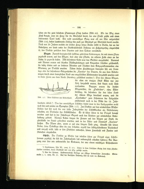 selten ein bis zwei beladene Planwagen Platz fanden (Abb. 60). Wo der Weg einen Fluß kreuzte, war ein Ferge für die Überfahrt bereit, der eine Pacht zahlte und einen bestimmten Tarif hatte. Ein recht urwüchsiger Gong war oft am Ufer aufgerichtet (Abb. s s6), dessen lauttönende Schläge ihn auch zur Abendzeit zur Überfahrt bereit machte. Noch vor 20 fahren waltete ein folcher Ferge seines Amtes selbst in Berlin, der an der Unterspree, wo heute unter der Stadtbahnbrücke Bellevue ein Fußgängersteg eingerichtet ist, den Verkehr zwischen dem Barnim und dem Teltow vermittelte.