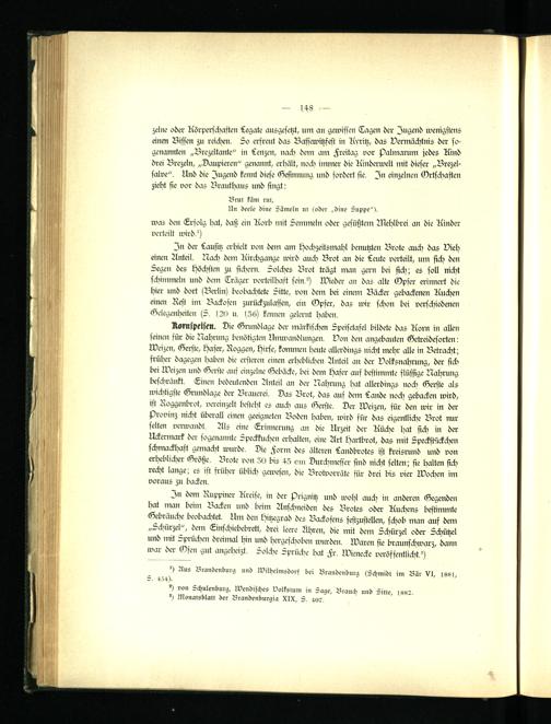 In dem Ruppiner Kreise, in der sAignitz und wohl auch in anderen Gegenden hat man beim Backen und beim Anschneiden des Brotes oder Kuchens bestimmte Gebräuche beobachtet. Um den Hitzegrad des Backofens festzustellen, schob man auf dem „Schürzet", dem Einschiebebrett, drei leere Ähren, die mit dem Schürzet oder Schützet und mit Sprüchen dreimal hin und hergeschoben wurden. Waren sie braunschwarz, dam war der (Ofen gut angeheizt, solche - prüebe bat Fr. Wienecke veröffentlicht?)