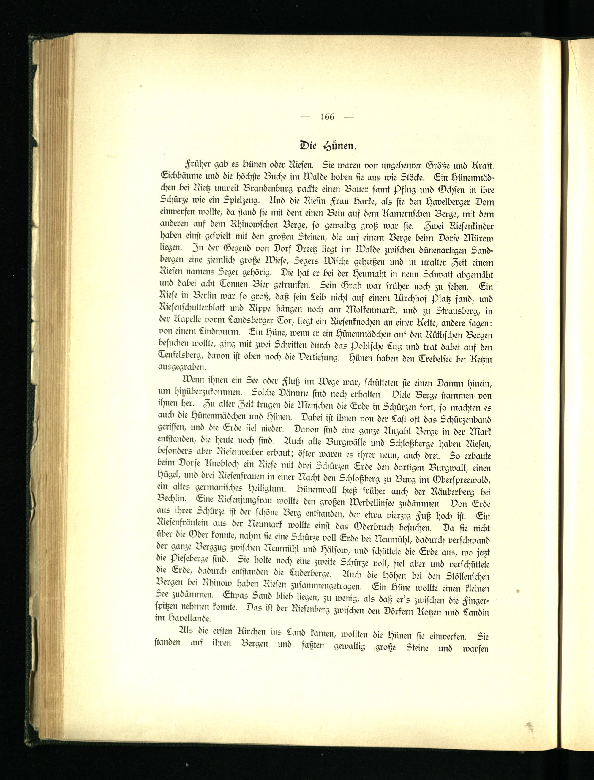 Früher gab es Hünen oder Riesen, Sie waren von ungeheurer Größe und Kraft. Eichbäume und die höchste Buche im Walde hoben sie aus wie Stöcke. Gin Hünenmädchen bei Rietz unweit Brandenburg packte einen Bauer samt schlug und Ochsen in ihre Schürze wie ein Spielzeug. Und die Riesin Frau Harke, als sie den Havelberger Dom einwerfen wollte, da stand sie mit dem einen Bein auf dem Kamernschen Berge, m t dem anderen auf dein Rhinowschen Berge, so gewaltig groß war sie. Zwei Riesenkinder haben einst gespielt mit den großen Steinen, die auf einem Berge beim Dorfe Mürow liegen. Zu der Gegend von Dorf Dreetz liegt im Walde zwischen dünenartigen Sandbergen eine ziemlich große Wiese, Segers Wische geheißen und in uralter Zeit einem Riesen namens Seger gehörig. Die hat er bei der Heumaht in neun Schwatt abgemäht und dabei acht Tonnen Bier getrunken. Sein Grab war früher noch zu sehen. Gin Riese in Berlin war so groß, daß sein Leib nicht auf einem Kirchhof schätz fand, und Riesenschulterblatt und Rippe hängen noch am Nolkenmarkt, und zu Strausberg, in der Kapelle vorm Landsberger Tor, liegt ein Riesenknochen an einer Kette, andere sagen: von einem Lindwurm. Gin Hüne, wenn er ein Hünenmädchen auf den Rüthschen Bergen besuchen wollte, ging mit zwei Schritten durch das s)ohlsche Lug und trat dabei auf den Teufelsbcrg, davon ist oben noch die Vertiefung. Hünen haben den Trebelsee bei Ketzin ausgegraben.