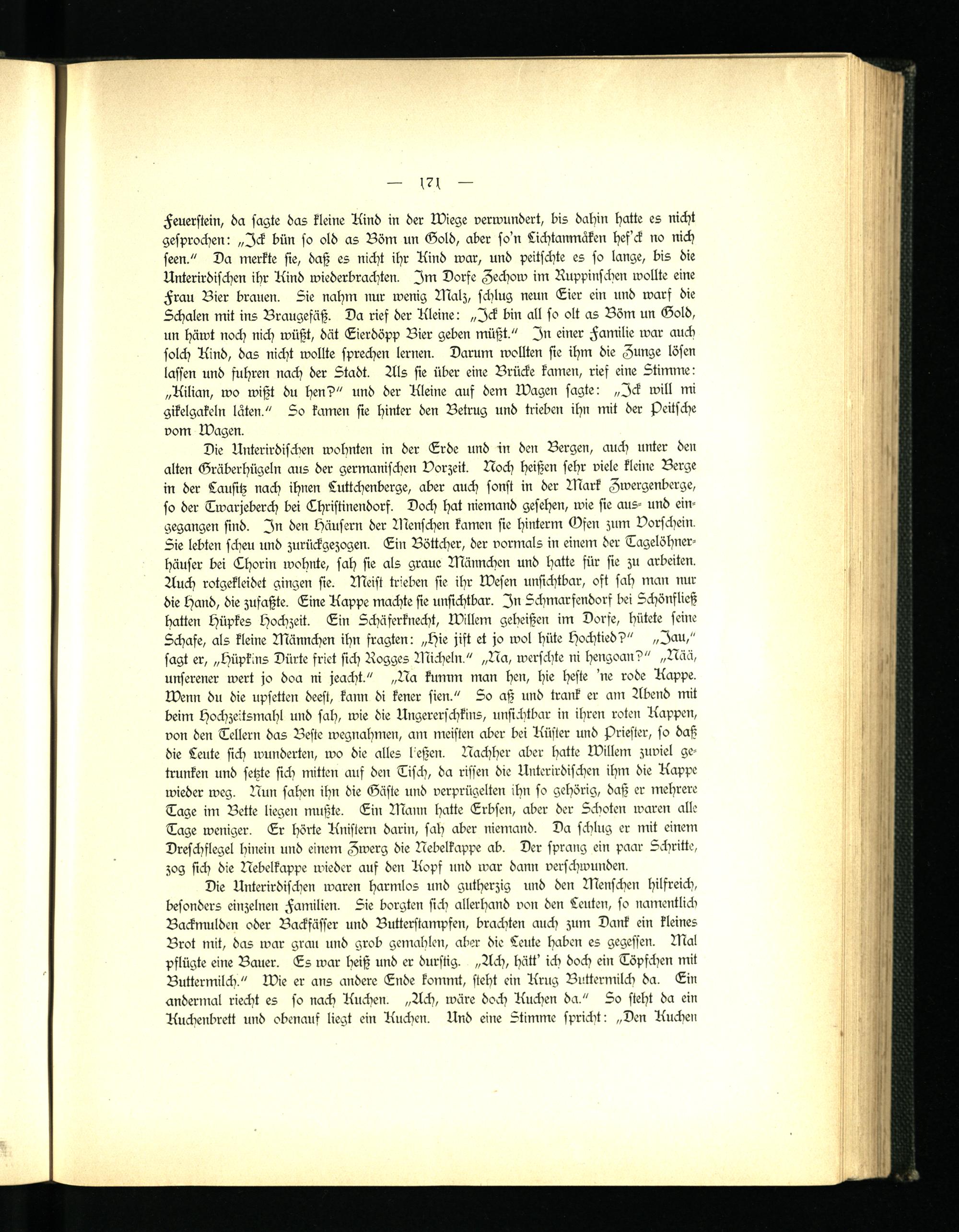 Feuerstein, da sagte das kleine Aind in der Wiege verwundert, bis dahin hatte es nicht gesprochen: „Ick bün so old as Böm un Gold, aber so'n Lichtanmäken hef'ck no nich seen." Da merkte sie, daß es nicht ihr Aind war, und peitschte es so lange, bis die Unterirdischen ihr Aind wiederbrachten. Im Dorfe Zechow im Ruppinschen wollte eine Frau Bier brauen. Sie nahm nur wenig Walz, schlug neun Gier ein und warf die Schalen mit ins Braugefäß. Da rief der Aleine: „Ick bin all so olt as Böm un Gold, un häwt noch nich wüßt, dät Gierdöpp Bier geben müßt." In einer Familie war auch solch Aind, das nicht wollte sprechen lernen. Darum wollten sie ihm die Zunge lösen lassen und fuhren nach der Stadt. Als sie über eine Brücke kamen, rief eine Stimme: „Ailian, wo wißt du hen?" und der Aleine auf dem Wagen sagte: „Ick will mi gikelgakeln läten." 5o kamen sie hinter den Betrug und trieben ihn mit der peitsche vom Wagen.