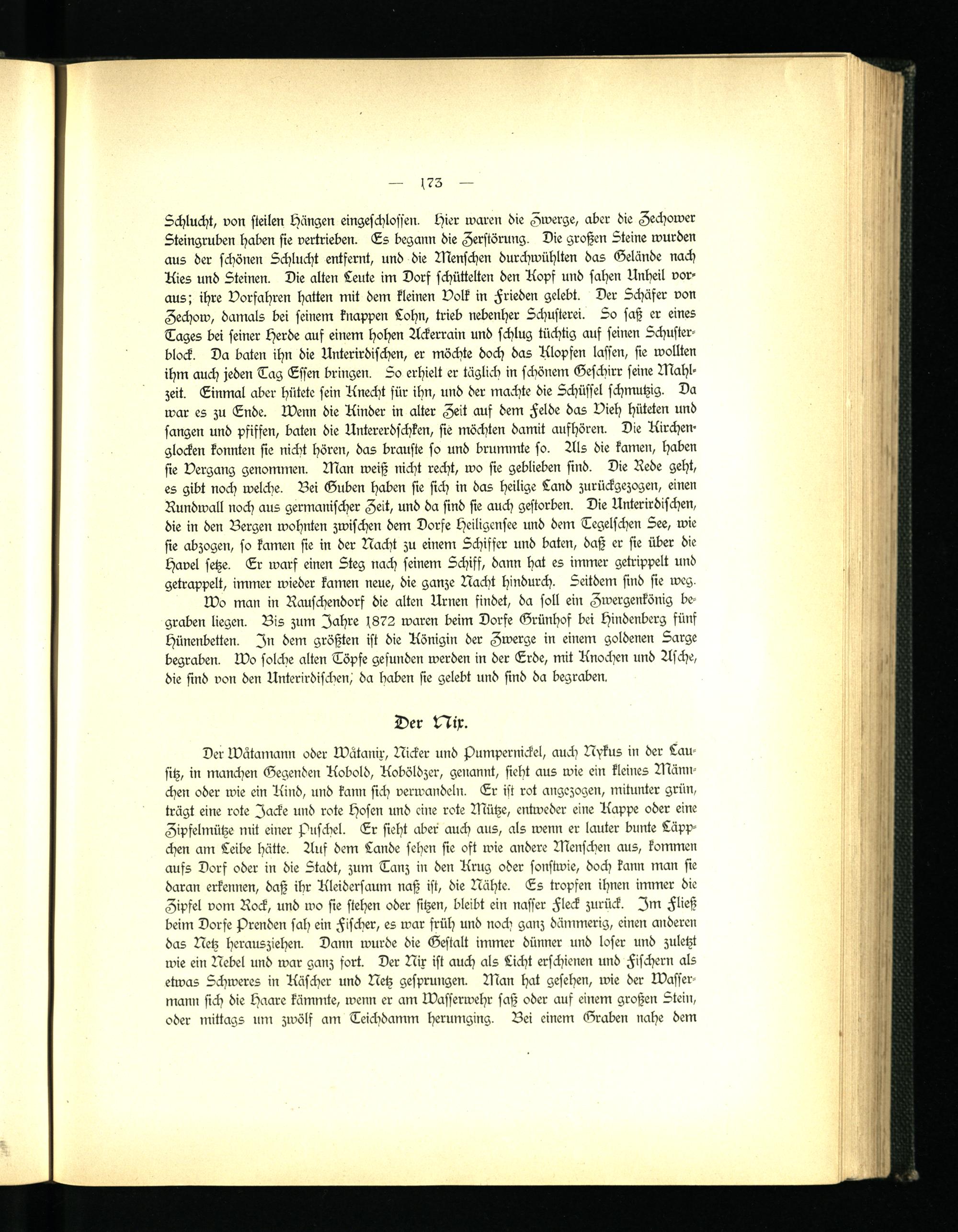 Der Wätamann oder Watanir, Nicker und Pumpernickel, auch Nykus in der Lausitz, in manchen Gegenden Kobold, Koböldzer, genannt, sieht aus wie ein kleines Männchen oder wie ein Kind, und kann sich verwandeln. Er ist rot angezogen, mitunter grün, trägt eine rote Jacke und rote Hosen und eine rote Mütze, entweder eine Kappe oder eine Zipfelmütze mit einer Puschel. Er sieht aber auch aus, als wenn er lauter bunte Läppchen am Leibe hätte. Auf dem Lande sehen sie oft wie andere Menschen aus, kommen aufs Dorf oder in die Stadt, zum Tanz in den Krug oder sonstwie, doch kann man sie daran erkennen, daß ihr Kleidersaum naß ist, die Nähte. Es tropfen ihnen immer die Zipfel vom Rock, und wo sie stehen oder sitzen, bleibt ein nasser Fleck zurück. Im Fließ beim Dorfe Prenden sah ein Fischer, es war früh und noch ganz dämmerig, einen anderen das Netz herausziehen. Dann wurde die Gestalt immer dünner und loser und zuletzt wie ein Nebel und war ganz fort. Der Nir ist auch als Licht erschienen und Fischern als etwas Schweres in Käscher und Netz gesprungen. Man hat gesehen, wie der Wassermann sich die haare kämmte, wenn er am Wasserwehr saß oder auf einem großen Stein, oder mittags um zwölf am Teichdamm herumging. Bei einem Graben nahe dem