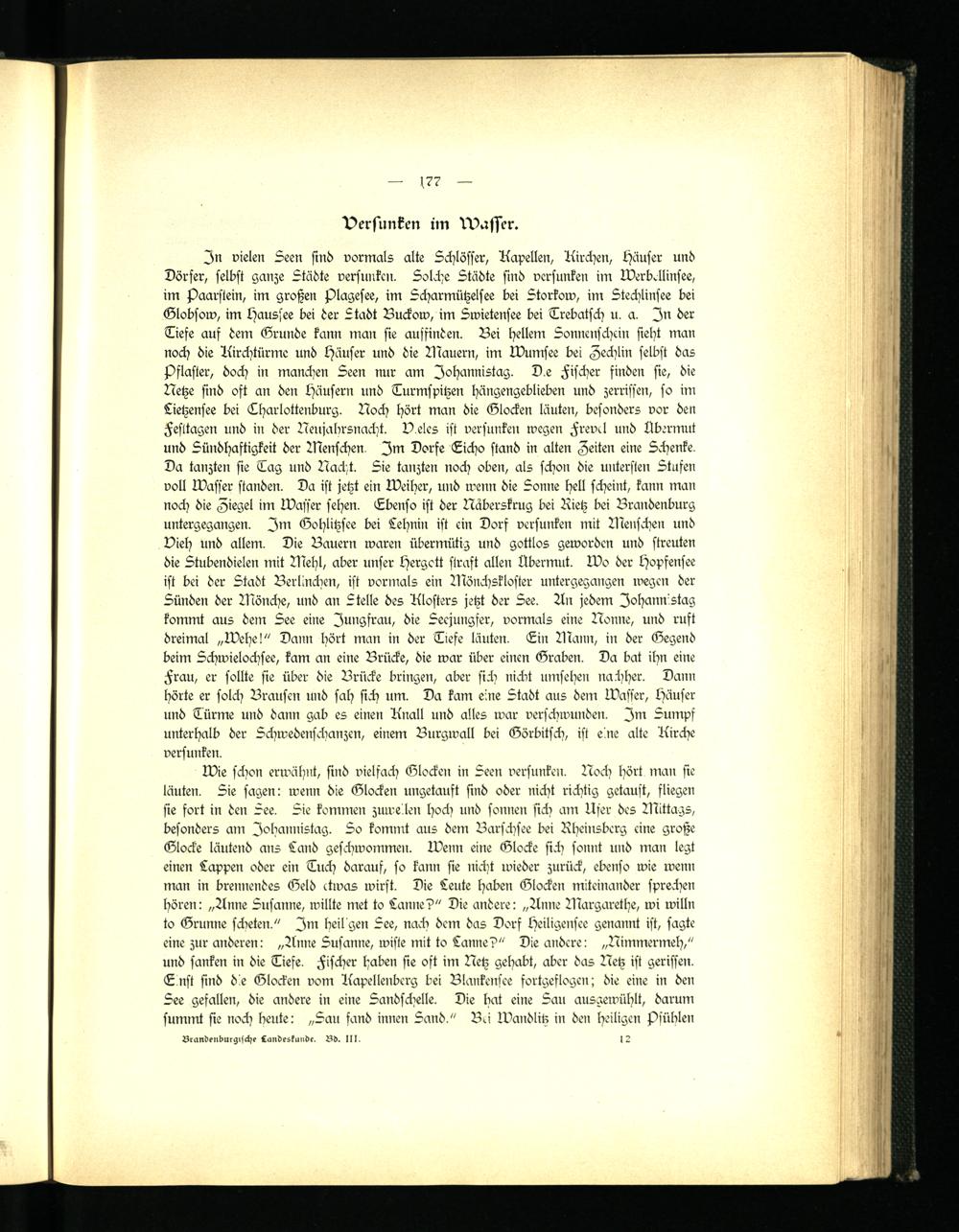 In vielen Leen sind vormals alte Schlösser, Kapellen, Kirchen, Häuser und Dörfer, selbst ganze Städte versunken. Solche Städte sind versunken im Werbellinsee, im Paarstein, im großen Plagesee, im Scharmützelsee bei Storkow, im Stechlinsee bei Globsow, im Haussee bei der Stadt Buckow, im Swietensee bei Trebatsch u. a. In der Tiefe auf dem Grunde kann man sie ausfinden. Bei Hellem Sonnenschein sieht man noch die Kirchtürme und Häuser und die Mauern, im Wumsee bei Zechlin selbst das Pflaster, doch in manchen Seen nur am Johannistag. D e Fischer finden sie, die Netze sind oft an den Häusern und Turmspitzen hängengeblieben und zerrissen, so im Sietzensee bei Tharlottenburg. Noch hört man die Glocken läuten, besonders vor den Festtagen und in der Neujabrsnacht. V.eles ist versunken wegen Frevel und Übermut und Sündhaftigkeit der Menschen. Im Dorfe Ticho stand in alten Zeiten eine Schenke. Da tanzten sie Tag und Nacht. Sie tanzten noch oben, als schon die untersten Stufen voll Wasser standen. Da ist jetzt ein Weiher, und wenn die Sonne hell scheint, kann man noch die Ziegel im Wasser sehen. Ebenso ist der Näberskrug bei Rietz bei Brandenburg untergegangen. Im Gohlitzsee bei Lehnin ist ein Dorf versunken mit Menschen und Vieh und allem. Die Bauern waren übermütig und gottlos geworden und streuten die Stubendielen mit Mehl, aber unser Hergott straft allen Übermut. Wo der Hopfensee ist bei der Stadt Berlinchen, ist vormals ein Mönchskloster untergegangen wegen der Sünden der Mönche, und an Stelle des Klosters jetzt der See. An jedem Johannistag kommt aus dem See eine Jungfrau, die Seejungfer, vormals eine Nonne, und ruft dreimal „Wehe!" Dann hört man in der Tiefe läuten. Tin Mann, in der Gegend beim Schwielochsee, kam an eine Brücke, die war über einen Graben. Da bat ihn eine Frau, er sollte sie über die Brücke bringen, aber sich nickt umsehen nachher. Dann hörte er solch Brausen und sah sich um. Da kam eine Stadt aus dem Wasser, Häuser und Türme und dann gab es einen Knall und alles war verschwunden. Im Sumpf unterhalb der Schwedenschanzcn, einem Burgwall bei Görbitsch, ist eine alte Kirche versunken.