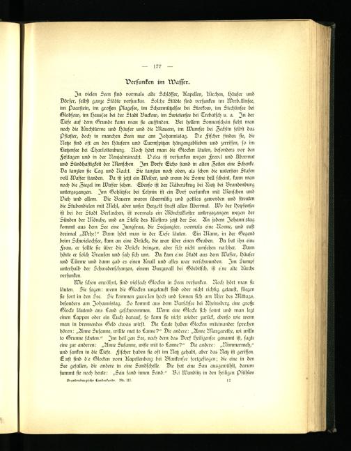 Wie schon erwähnt, sind vielfach Glocken in Seen versunken. Noch hört man sic läuten. Sie sagen: wenn die Glocken ungetanst sind oder nicht richtig getauft, fliegen sie fort in den See. Sie kommen zuweilen hoch und sonnen sich am User des Mittags, besonders am Johannistag. So kommt aus dem Barschsee bei Rheinsbcrg eine große Glocke läutend ans Land geschwommen. Wenn eine Glocke sich sonnt und man legt einen Lappen oder ein Tuch darauf, so kann sie nicht wieder zurück, ebenso wie wenn man in brennendes Geld ctwas wirst. Die Leute haben Glocken miteinander sprechen hören: „Anne Susanne, willte met to Lanne?" Die andere: „Anne Margarethe, wi willn to Grunne scketen." Im heil gen See, nach dem das Dorf Heiligensee genannt ist, sagte eine zur anderen: „Anne Susanne, wiste mit to Lanne?" Die andere: „Nimmermeh," und sanken in die Tiefe. Fischer haben sie oft im Netz gehabt, aber das Netz ist gerissen. T nst sind d e Glocken vom Kapellenbcrg bei Blankensee fortgeflogcn; die eine in den See gefallen, die andere in eine Sandschelle. Die hat eine Sari ausgewühlt, darum summt sie noch beute: „Sau fand innen Sand." Bck Wandlitz in den heiligen psüblen