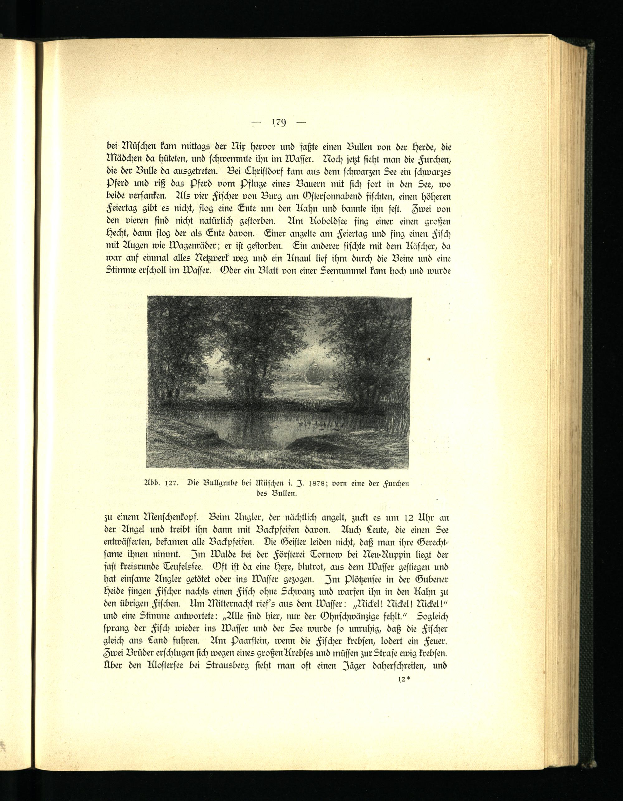 bei Müschen kam mittags der Nix hervor und faßte einen Lullen von der Herde, die Mädchen da hüteten, und schwemmte ihn im Wasser. Noch jetzt sieht man die Furchen, die der Bulle da ausgetreten. Bei Thristdorf kam aus dem schwarzen See ein schwarzes Pferd und riß das Pferd vom Pfluge eines Bauern mit sich fort in den See, wo beide versanken. Als vier Fischer von Burg am Gstersonnabend fischten, einen höheren Feiertag gibt es nicht, flog eine Ente um den Aahn und bannte ihn fest. Zwei von den vieren sind nicht natürlich gestorben. Am Aoboldsee fing einer einen großen Hecht, dann flog der als Ente davon. Einer angelte am Feiertag und fing einen Fisch mit Augen wie Wagenräder; er ist gestorben. Ein anderer fischte mit dem Wischer, da war auf einmal alles Netzwerk weg und ein Anaul lief ihm durch die Beine und eine Stimme erscholl im Wasser. Oder ein Blatt von einer Seemummel kam hoch und wurde