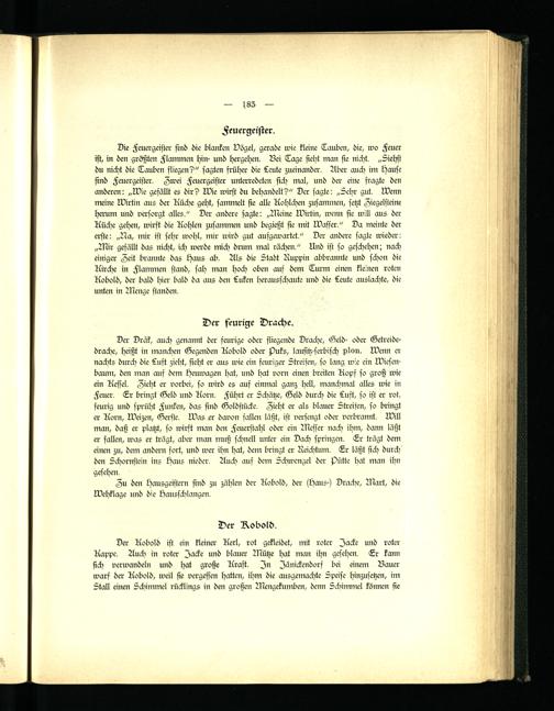 Die Feuergeister sind die blanken Vögel, gerade wie kleine Tauben, die, wo Feuer ist, in den größten Flammen hin- und hergehen. Bei Tage sieht man sie nicht. „Ziehst du nicht die Tauben fliegen?" sagten früher die Leute zueinander. Aber auch im Hause sind Feuergeister. Zwei Feuergeister unterredeten sich mal, und der eine fragte den anderen: „Wie gefällt es dir? Me wirst du behandelt?" Der sagte: „Sehr gut. Wenn meine Wirtin aus der Küche geht, sammelt sie alle Kohlchen zusammen, setzt Ziegelsteine herum und versorgt alles." Der andere sagte: „Weine Wirtin, wenn sie will aus der Küche gehen, wirft die Kohlen zusammen und begießt sie mit Wasser." Da meinte der erste: „Na, mir ist sehr wohl, mir wird gut aufgewartet." Der andere sagte wieder: „Wir gefällt das nicht, ich werde mich drum mal rächen." Und ist so geschehen; nach einiger Zeit brannte das Haus ab. Als die Stadt Ruppin abbrannte und schon die Kirche in Flammen stand, sah man hoch oben auf dem Turm einen kleinen roten Kobold, der bald hier bald da aus den Luken herausschaute und die Leute auslachte, die unten in Wenge standen.