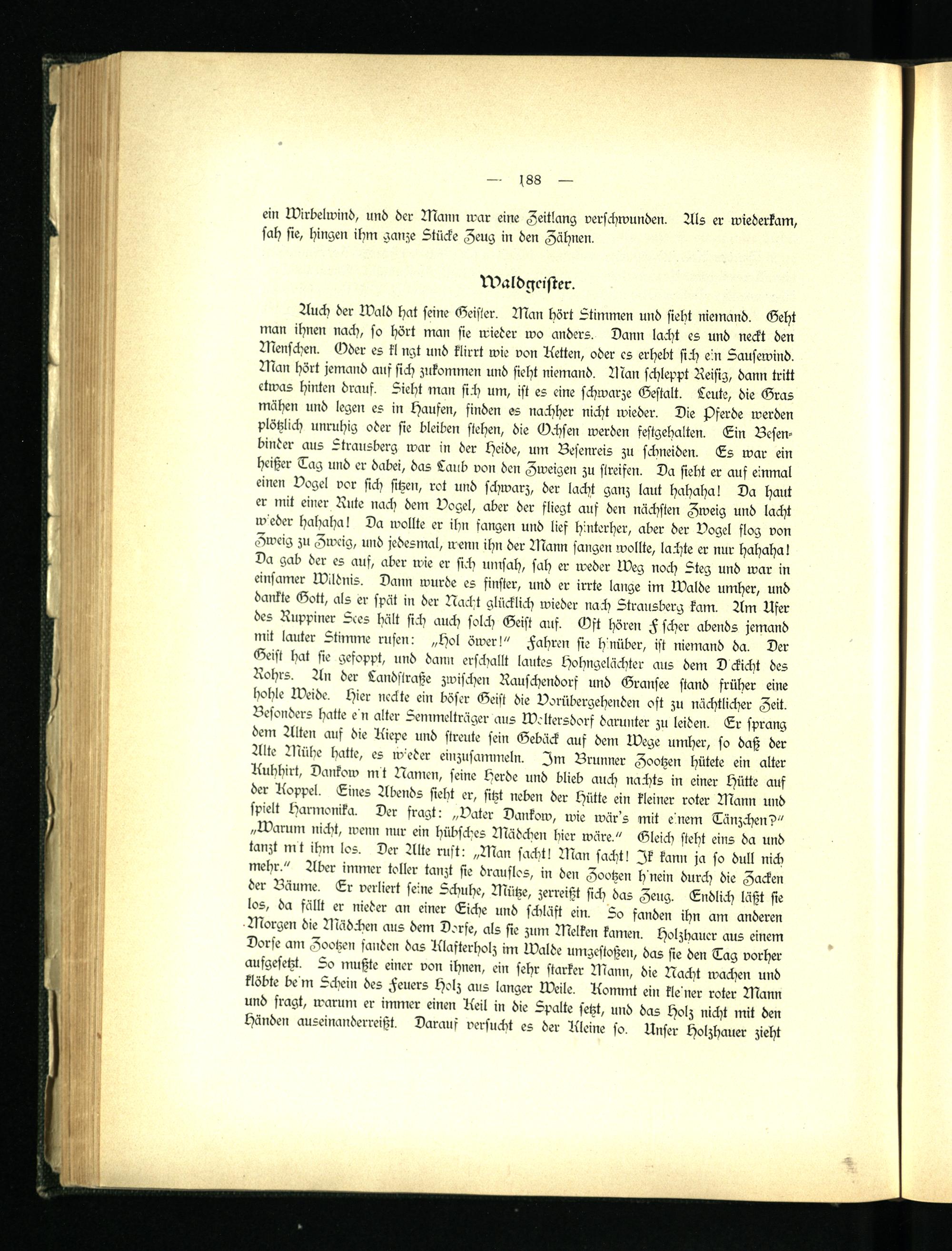Geist hat sie gefoppt, und dann erschallt lautes Hohngelächter aus dem D ckicht des Rohrs. An der Landstraße zwischen Rauschendorf und Gransee stand früher eine hohle Weide. Hier neckte ein böser Geist die Vorübergehenden oft zu nächtlicher Zeit. Besonders hatte e n alter Semmelträger aus Weltersdorf darunter zu leiden. Lr sprang dem Alten auf die Kiepe und streute sein Gebäck auf dem Wege umher, so daß der Alte Ukübe hatte, es wieder einzusammeln. Zm Brunner Zootzen hütete ein alter Kuhhirt, Dankow mt Namen, seine Herde und blieb auch nachts in einer Hütte auf der Koppel. Lines Abends sieht er, sitzt neben der Hütte ein kleiner roter Wann und spielt Harmonika. Der fragt: „Vater Dankow, wie wär's mit e nem Tänzchen?" „Warum nicht, wenn nur ein hübsches Wädchen hier wäre." Gleich steht eins da und tanzt mt ihm los. Der Alte ruft: „Wan sacht! Wan sacht! Zk kann ja so dull nich mehr." Aber immer toller tanzt sie drauslos, in den Zootzen h nein durch die Zacken der Bäume. Lr verliert seine Schuhe, Wütze, zerreißt sich das Zeug. Lndlich läßt sie los, da fällt er nieder an einer Liehe und schläft ein. So fanden ihn am anderen Worgen die Wädchen aus dem Dorfe, als sie zum Welken kamen. Holzhauer aus einem Dorse am Zootzen fanden das Klasterholz im Walde umgestoßen, das sie den Tag vorher aufgesetzt. So mußte einer von ihnen, ein sehr starker Wann, die Nacht wachen und klöbte be m Schein des Feuers Holz aus langer weile. Kommt ein kle'ner roter Wann und fragt, warum er immer einen Keil in die Spalte setzt, und das Holz nicht mit den Händen auseinanderreißt. Darauf versucht es der Kleine so. Unser Holzhauer zieht