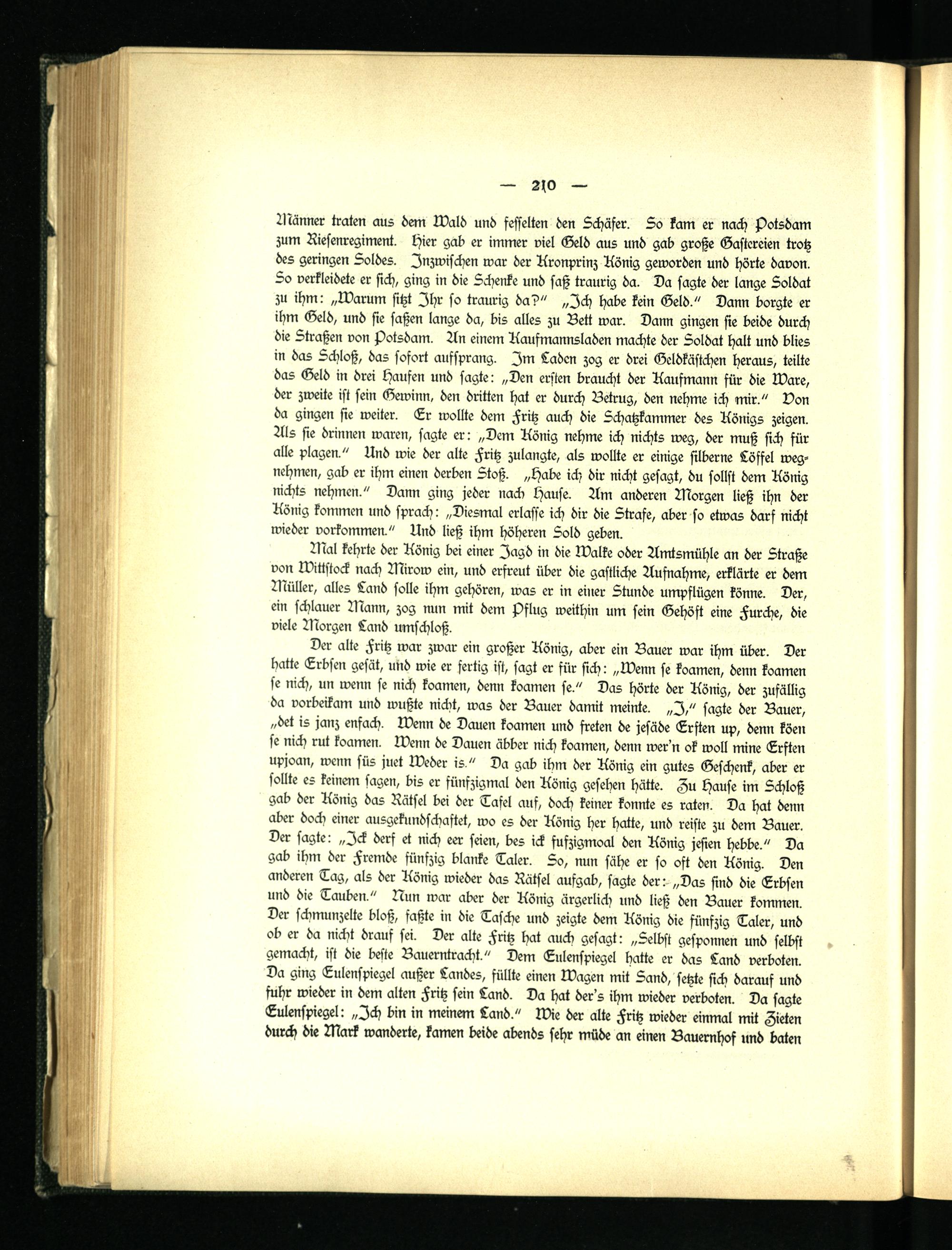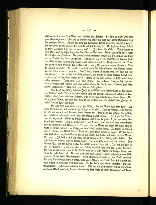 Der alte Fritz war zwar ein großer König, aber ein Bauer war ihm über. Der batte Erbsen gesät, und wie er fertig ist, sagt er für sich: „Wenn se koamen, denn koamen se nich, un wenn se nich koamen, denn koamen se." Das hörte der König, der zufällig da vorbeikam und wußte nicht, was der Bauer damit meinte. „I," sagte der Bauer, „det is janz enfach. Wenn de Dauen koamen un- freien de jesäde Ersten up, denn körn se nich rut koamen. Wenn de Dauen äbber nich koamen, denn wer'n ok woll mine Ersten upjoan, wenn süs juet Weder is." Da gab ihm der König ein gutes Geschenk, aber er sollte es keinem sagen, bis er fünfzigmal den König gesehen hätte. Zu Hause im Schloß gab der König das Rätsel bei der Tafel auf, doch keiner konnte es raten. Da hat denn aber doch einer ausgekundschaftet, wo es der König her hatte, und reiste zu dem Bauer. Der sagte: „Ick derf et nich eer seien, des ick fufzigmoal den König festen hebbe." Da gab ihm der Fremde fünfzig blanke Taler. 5o, nun sähe er so oft den König. Den anderen Tag, als der König wieder das Rätsel aufgab, sagte der:-„Das sind die Erbsen und die Tauben." Nun war aber der König ärgerlich und ließ den Bauer kommen. Der schmunzelte bloß, faßte in die Tasche und zeigte dem König die fünfzig Taler, und ob er da nicht drauf sei. Der alte Fritz hat auch gesagt: „Selbst gesponnen und selbst gemacht, ist die beste Bauerntracht." Dem Eulenspiegel hatte er das Land verboten. Da ging Eulenspiegel außer Landes, füllte einen Wagen mit Sand, setzte sich darauf und fuhr wieder in dem alten Fritz sein Land. Da hat der's ihm wieder verboten. Da sagte Lulenspiegel: „Ich bin in meinem Land." wie der alte Fritz wieder einmal mit Zielen durch die Mark wanderte, kamen beide abends sehr müde an einen Bauernhof und baten