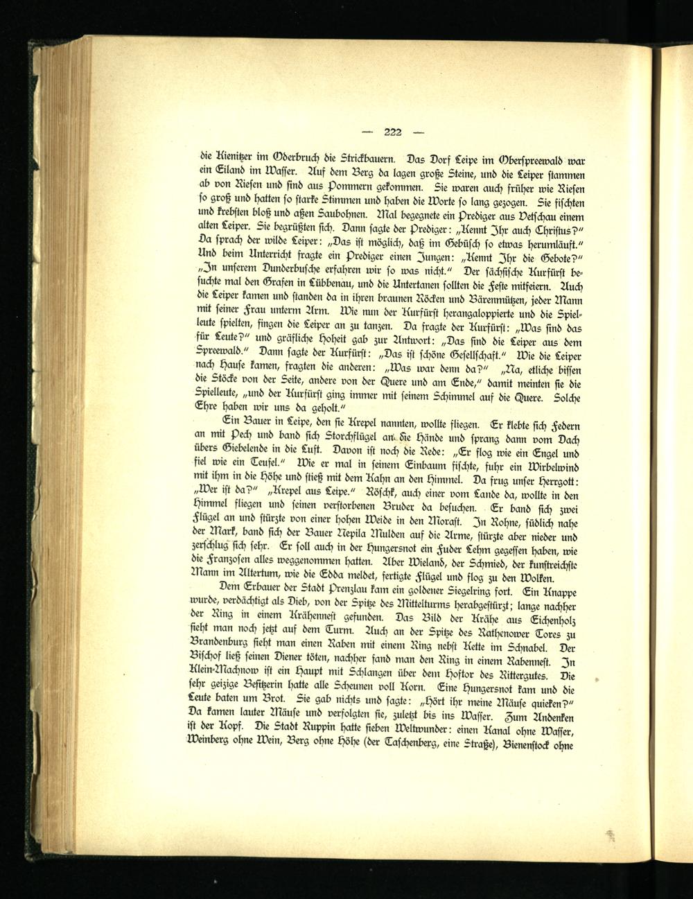 die Rienitzer im Dderbruch die Strickbauern. Das Dorf Leipe im Mberspreewald war ein Eiland im Wasser. Auf dem Berg da lagen große Steine, und die Leiper stammen ab von Riesen und sin- aus Sommern gekommen. Sie waren auch früher wie Riesen so groß und hatten so starke Stimmen und haben die Worte so lang gezogen. Sie fischten und krebsten bloß und aßen Saubohnen. Wal begegnete ein Prediger aus Vetschau einem alten Leiper. Sie begrüßten sich. Dann sagte der Prediger: „Rennt Ihr auch Thristus?" Da sprach der wilde Leiper: „Das ist möglich, daß im Gebüsch so etwas herumläuft." Und beim Unterricht fragte ein Prediger einen Jungen: „Rennt Ihr die Gebote?" „In unserem Dunderbusche erfahren wir so was nicht." Der sächsische Rurfürst besuchte mal den Grafen in Lübbenau, und die Untertanen sollten die Hefte mitfeiern. Auch die Leiper kamen und standen da in ihren braunen Röcken und Bärenmützen, jeder Wann mit seiner Frau unterm Arm. Wie nun der Rurfürst herangaloppierte und die Spielleute spielten, fingen die Leiper an zu tanzen. Da fragte der Rurfürst: „Was sind das für Leute?" und gräfliche Hoheit gab zur Antwort: „Das sind die Leiper aus dem Spreewald." Dann sagte der Rurfürst: „Das ist schöne Gesellschaft." Wie die Leiper nach Hause kamen, fragten die anderen: „Was war denn da?" „Na, etliche bissen die Stöcke von der Seite, andere von der Auere und am Ende," damit meinten sie die Spielleute, „und der Rurfürst ging immer mit seinem Schimmel auf die Tuere. Solche Ehre haben wir uns da geholt."
