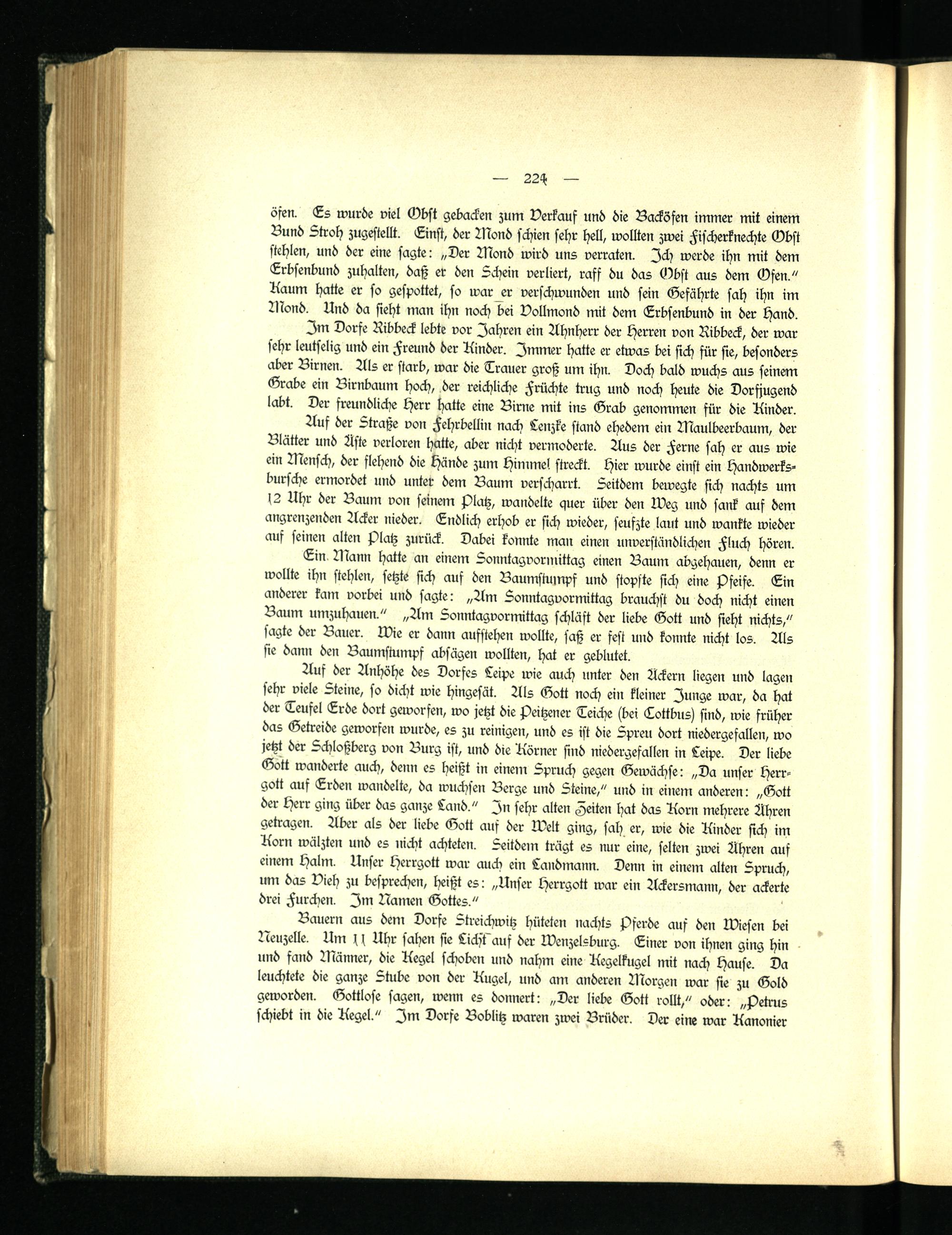 Auf der Anhöhe des Dorfes Leipe wie auch unter den Ackern liegen und lagen sehr viele Steine, so dicht wie hingesät. Als Gott noch ein kleiner Junge war, da hat der Teufel Erde dort geworfen, wo jetzt die peitzener Teiche (bei Tottbus) sind, wie früher das Getreide geworfen wurde, es zu reinigen, und es ist die Spreu dort niedergefallen, wo jetzt der Schloßberg von Burg ist, und die Körner sind niedergefallen in Leipe. Der liebe Gott wanderte auch, denn es heißt in einein Spruch gegen Gewächse: „Da unser Herrgott auf Erden wandelte, da wuchsen Berge und Steine," und in einem anderen: „Gott der Herr ging über das ganze Land." In sehr alten Zeiten hat das Korn mehrere Ähren getragen. Aber als der liebe Gott auf der Welt ging, sah er, wie die Kinder sich im Korn wälzten und es nicht achteten. Seitdem trägt es nur eine, selten zwei Ähren auf einem Halm. Unser Herrgott war auch ein Landmann. Denn in einein alten Spruch, um das Vieh zu besprechen, heißt es : „Unser Herrgott war ein Ackersmann, der ackerte drei Furchen. Im Namen Gottes."