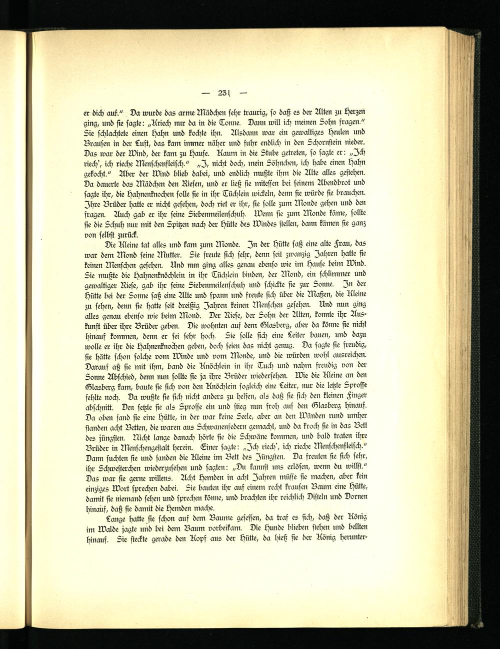 er dich auf." Da wurde das arme Mädchen sehr traurig, so daß es der Alten zu Herzen ging, und sie sagte: „Arisch nur da in die Tonne. Dann will ich meinen Sohn fragen." Sie schlachtete einen Hahn und kochte ihn. Alsdann war ein gewaltiges Heulen und Brausen in der Luft, das kam immer näher und fuhr endlich in den Schornstein nieder. Das war der Wind, der kam zu Hause. Aaum in die Stube getreten, so sagte er: „Ich riech', ich rieche Menschenfleisch." „I, nicht doch, inein Söhnchen, ich habe einen Hahn gekocht." Aber der Wind blieb dabei, und endlich mußte ihm die Alte alles gestehen. Da dauerte das Mädchen den Riesen, und er ließ sie mitessen bei seinem Abendbrot und sagte ihr, die Hahnenknochen solle sie in ihr Tüchlein wickeln, denn sie würde sie brauchen. Ihre Brüder hatte er nicht gesehen, doch riet er ihr, sie solle zum Monde gehen und den fragen. Auch gab er ihr seine Siebenmeilenschuh. Wenn sie zum Monde käme, sollte sie die Schuh nur mit den Spitzen nach der Hütte des Windes stellen, dann kämen sie ganz von selbst zurück.