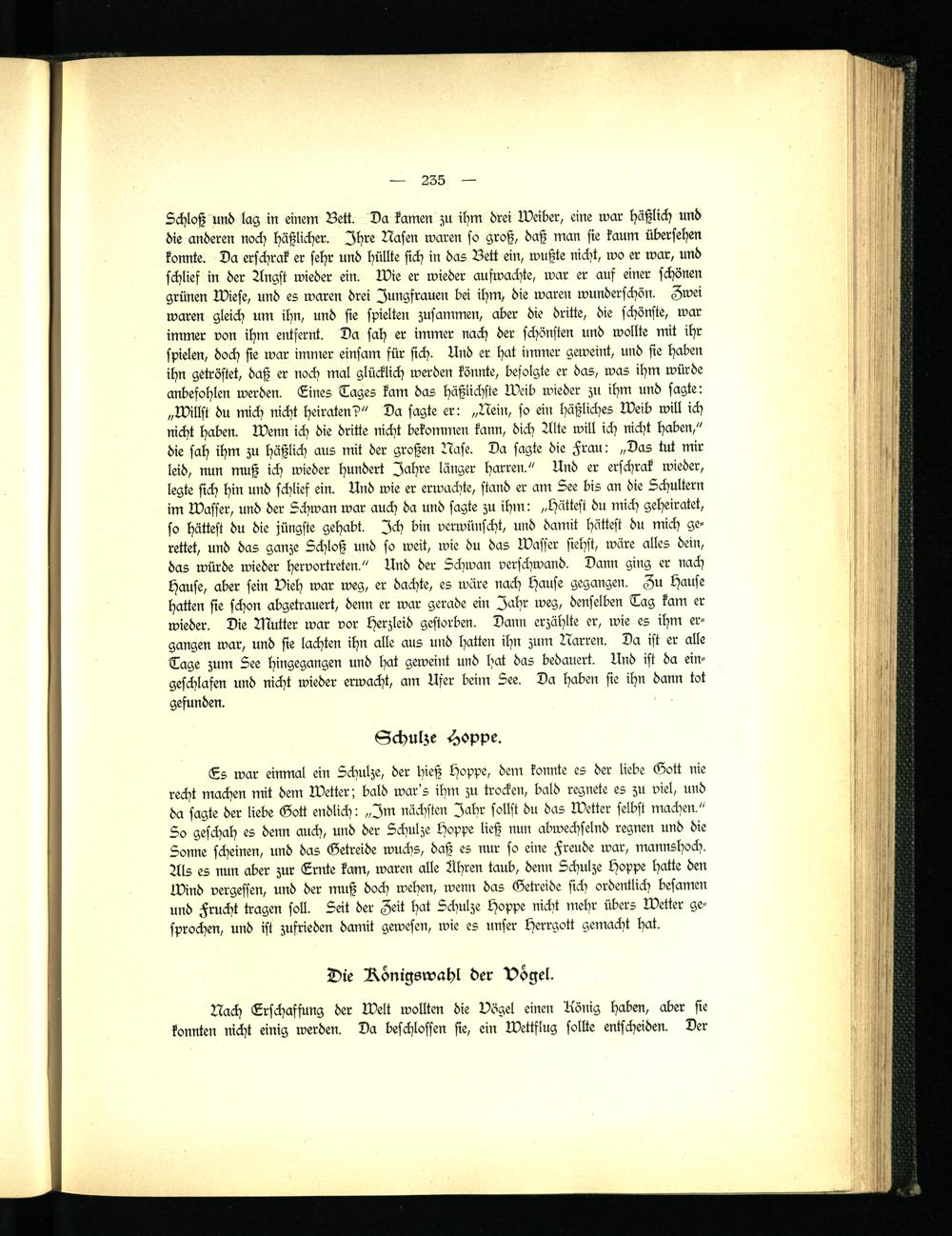 Schloß und lag in einem Bett. Da kamen zu ihm drei Weiber, eine war häßlich und die anderen noch häßlicher. Ihre Nasen waren so groß, daß man sie kaum übersehen konnte. Da erschrak er sehr und hüllte sich in das Bett ein, wußte nicht, wo er war, und schlief in der Angst wieder ein. Wie er wieder aufwachte, war er auf einer schönen grünen Wiese, und es waren drei Jungfrauen bei ihm, die waren wunderschön. Zwei waren gleich um ihn, und sie spielten zusammen, aber die dritte, die schönste, war immer von ihm entfernt. Da sah er immer nach der schönsten und wollte mit ihr spielen, doch sie war immer einsam für sich. Und er hat immer geweint, und sie haben ihn getröstet, daß er noch mal glücklich werden könnte, befolgte er das, was ihm würde anbefohlen werden. Lines Tages kam das häßlichste Weib wieder zu ihm und sagte: „Willst du mich nicht heiraten?" Da sagte er: „Nein, so ein häßliches Weib will ich nicht haben. Wenn ich die dritte nicht bekommen kann, dich Alte will ich nicht haben," die sah ihm zu häßlich aus mit der großen Nase. Da sagte die Krau: „Das tut mir leid, nun muß ich wieder hundert Jahre länger harren." Und er erschrak wieder, legte sich hin und schlief ein. Und wie er erwachte, stand er am See bis an die Schultern im Wasser, und der Schwan war auch da und sagte zu ihm: „hättest du mich geheiratet, so hättest du die jüngste gehabt. Ich bin verwünscht, und damit hättest du mich gerettet, und das ganze Schloß und so weit, wie du das Wasser siehst, wäre alles dein, das würde wieder hervortreten." Und der Schwan verschwand. Dann ging er nach Hause, aber sein Vieh war weg, er dachte, es wäre nach Hause gegangen. Zu Hause hatten sie schon abgetrauert, denn er war gerade ein Jahr weg, denselben Tag kam er wieder. Die Nkutter war vor herzleid gestorben. Dann erzählte er, wie es ihm ergangen war, und sie lachten ihn alle aus und hatten ihn zum Narren. Da ist er alle Tage zum Lee hingegangen und hat geweint und hat das bedauert. Und ist da eingeschlafen und nicht wieder erwacht, am Ufer beim 5ee. Da haben sie ihn dann tot gefunden.