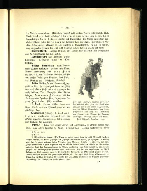 Abb. 1H5. „Der Tote trägt den Lebenden." Der Oberleib einer Frau aus Stroh wird getragen von einem Mann in Frauenrock, dem am Rücken Mannsbeine aus Stroh festgebunden sind, wohl eine Darstellung von Sommer und Winter; der Sommer als Sieger. Wendisch, jenseits der Grenze.