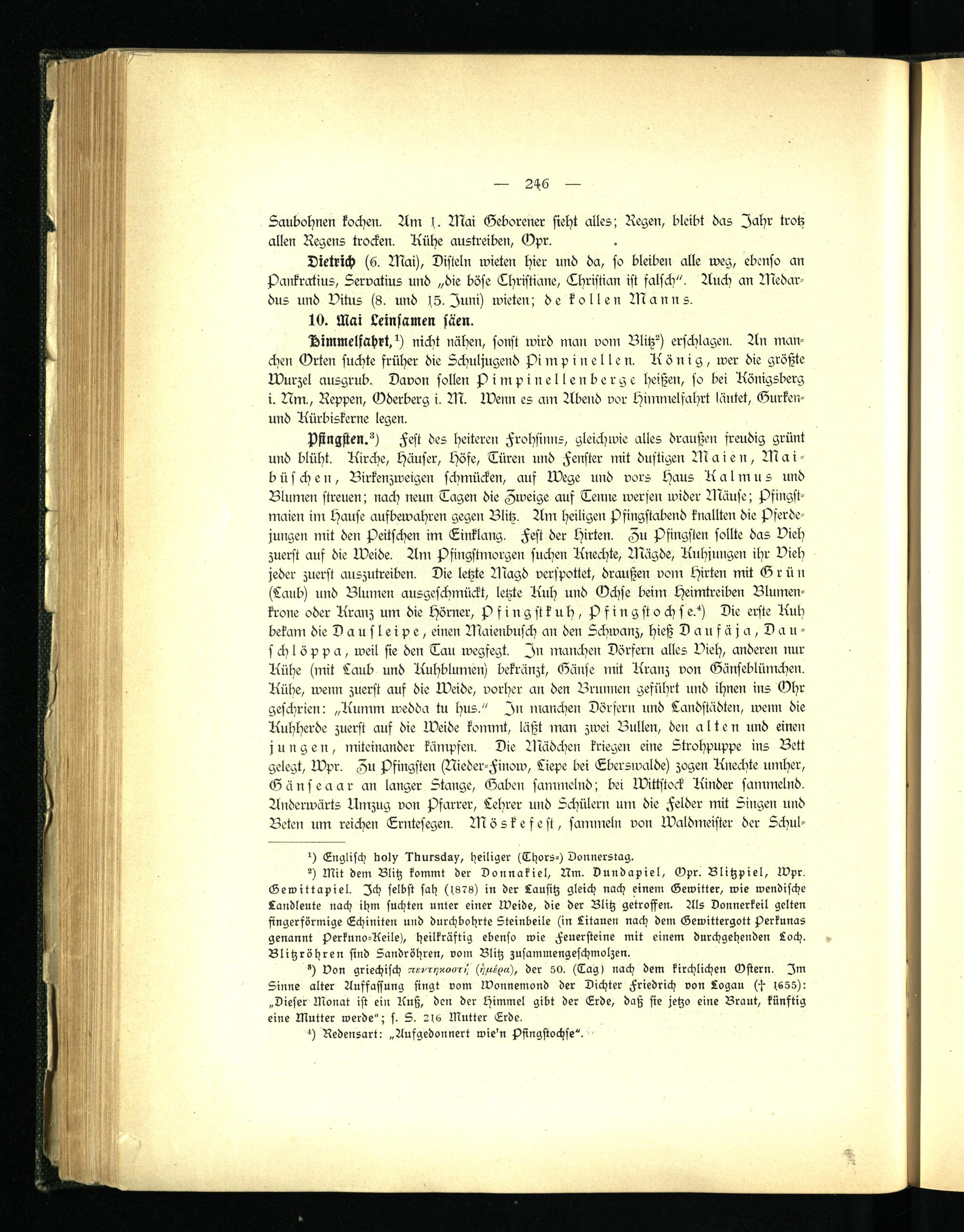 Bimmelfahrt, h nicht nähen, sonst wird man vom Blitzt erschlagen. An manchen Orten suchte früher die Schuljugend Pimpiuelleu. König, wer die größte Wurzel ausgrub. Davon sollen Pimpinellenberge heißen, so bei Königsberg i. Nm., Reppen, Oderberg i. M. Wenn es am Abend vor Himmelfahrt läutet, Gurken- und Kürbiskerne legen.