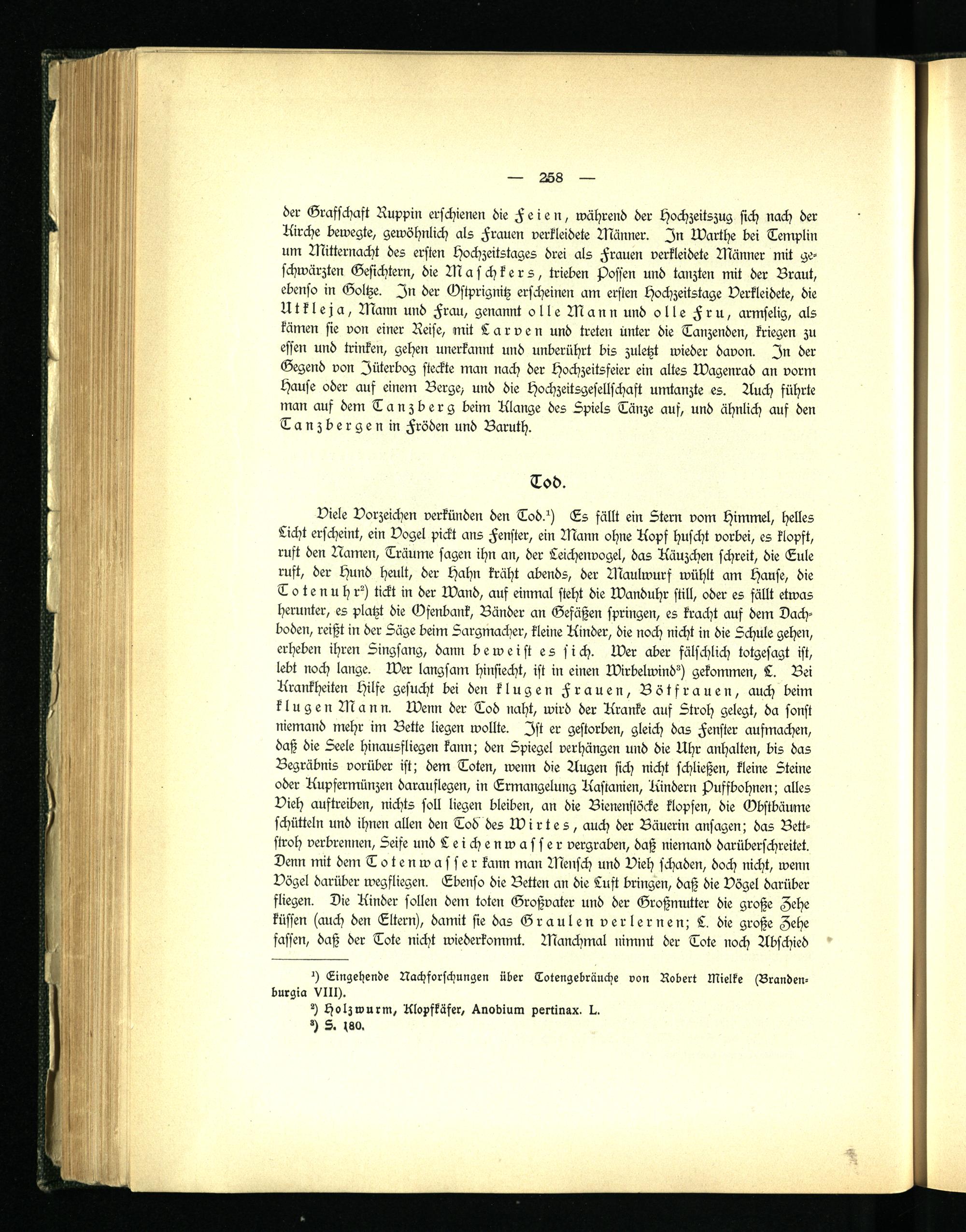 Viele Vorzeichen verkünden den Tod?) Ls fällt ein Stern vom Himmel, Helles Licht erscheint, ein Vogel pickt ans Fenster, ein Mann ohne Kopf huscht vorbei, es klopft, ruft den Namen, Träume sagen ihn an, der Leichenvogel, das Käuzchen schreit, die Eule ruft, der Hund heult, der Hahn kräht abends, der Maulwurf wühlt am Hause, die To 1 enuhrh tickt in der Wand, auf einmal steht die Wanduhr still, oder es fällt etwas herunter, es platzt die Ofenbank, Bänder an Gefäßen springen, es kracht auf dem Dachboden, reißt in der Läge beim Sargmacher, kleine Rinder, die noch nicht in die Schule gehen, erheben ihren Singsang, dann beweist es sich. Wer aber fälschlich totgesagt ist, lebt noch lange. Wer langsam hinsiecht, ist in einen Wirbelwinds gekommen, L. Bei Krankheiten Hilfe gesucht bei den klugen Frauen, Bötf rauen, auch beim klugen Mann. Wenn der Tod naht, wird der Kranke auf Stroh gelegt, da sonst niemand mehr im Bette liegen wollte. Ist er gestorben, gleich das Fenster aufmachen, daß die Seele hinausfliegen kann; den Spiegel verhängen und die Uhr anhalten, bis das Begräbnis vorüber ist; dem Toten, wenn die Augen sich nicht schließen, kleine Steine oder Kupfermünzen darauflegen, in Ermangelung Kastanien, Kindern Puffbohnen; alles Vieh auftreiben, nichts soll liegen bleiben, an die Bienenstöcke klopfen, die Obstbäume schütteln und ihnen allen den Tod des Wirtes, auch der Bäuerin ansagen; das Bettstroh verbrennen, Seife und Leichenwasser vergraben, daß niemand darüberschreitet. Denn mit dem Totenwasser kann man Mensch und Vieh schaden, doch nicht, wenn Vögel darüber wegfliegen. Ebenso die Betten an die Luft bringen, daß die Vögel darüber fliegen. Die Kinder sollen dem toten Großvater und der Großmutter die große Zehe küssen (auch den Eltern), damit sie das Graulen verlernen; L. die große Zehe fassen, daß der Tote nicht wiederkommt. Manchmal nimmt der Tote noch Abschied