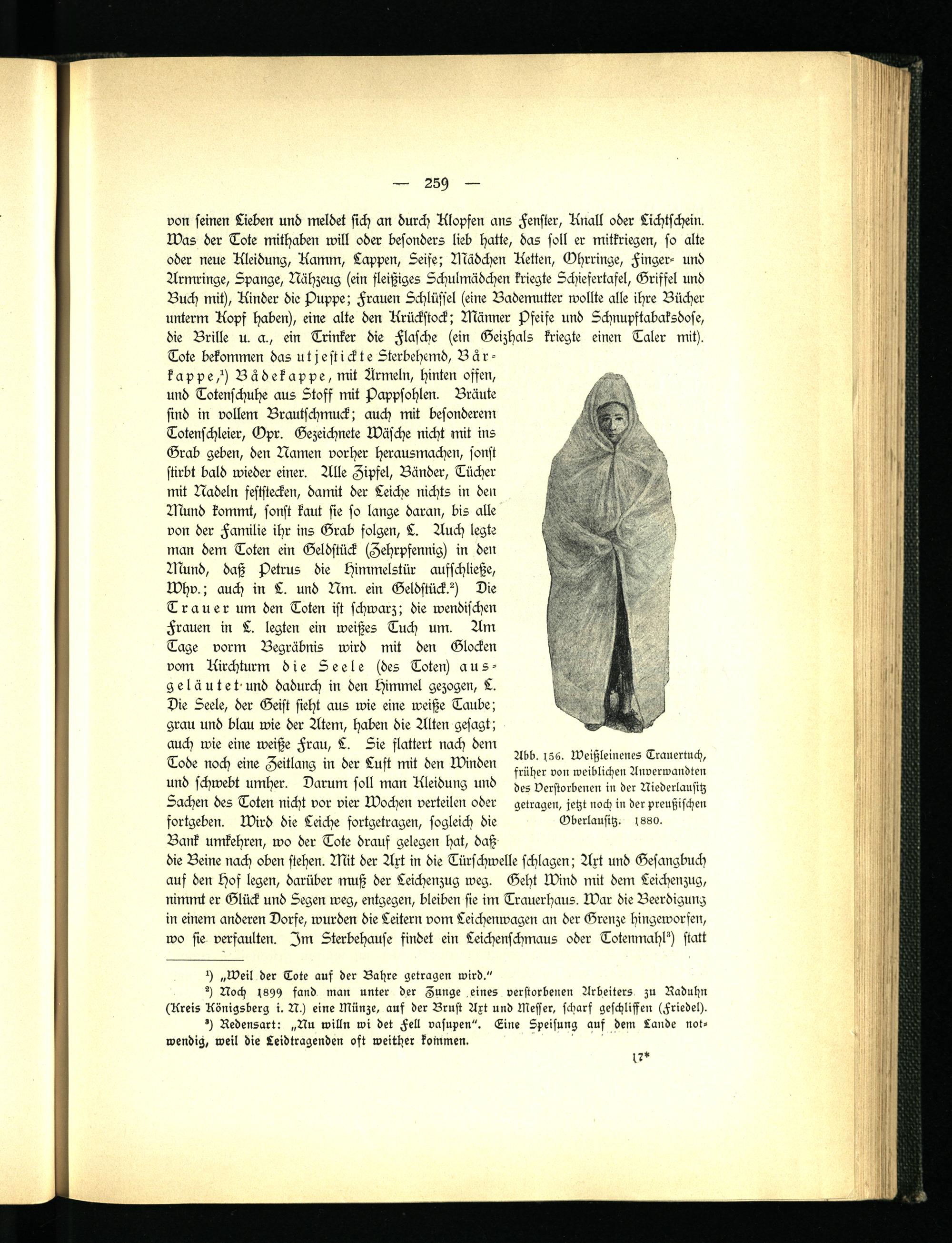 Abb. 156 . weißleinenes Trauertuch, früher von weiblichen Anverwandten des verstorbenen in der Niederlausitz getragen, jetzt noch in der preußischen Dberlausitz. 1880.